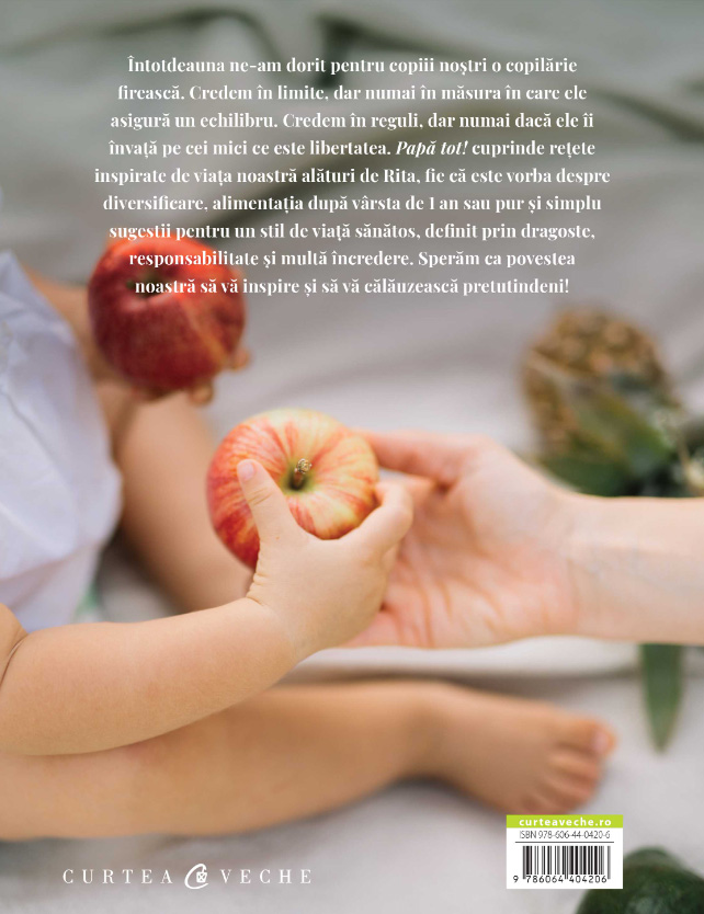 Întotdeauna ne-am dorit pentru copiii noștri o copilărie firească. Credem în limite, dar numai în măsura în care ele asigură un echilibru. Credem în reguli, dar numai dacă ele îi învață pe cei mici ce este libertatea. Papă tot! cuprinde rețete inspirate de viața noastră alături de Rita, fie că este vorba despre diversificare, alimentația după vârsta de 1 an sau pur și simplu sugestii pentru un stil de viață sănătos, definit prin dragoste, responsabilitate și multă încredere. Sperăm ca povestea noastră să vă inspire și să vă călăuzească pretutindeni!