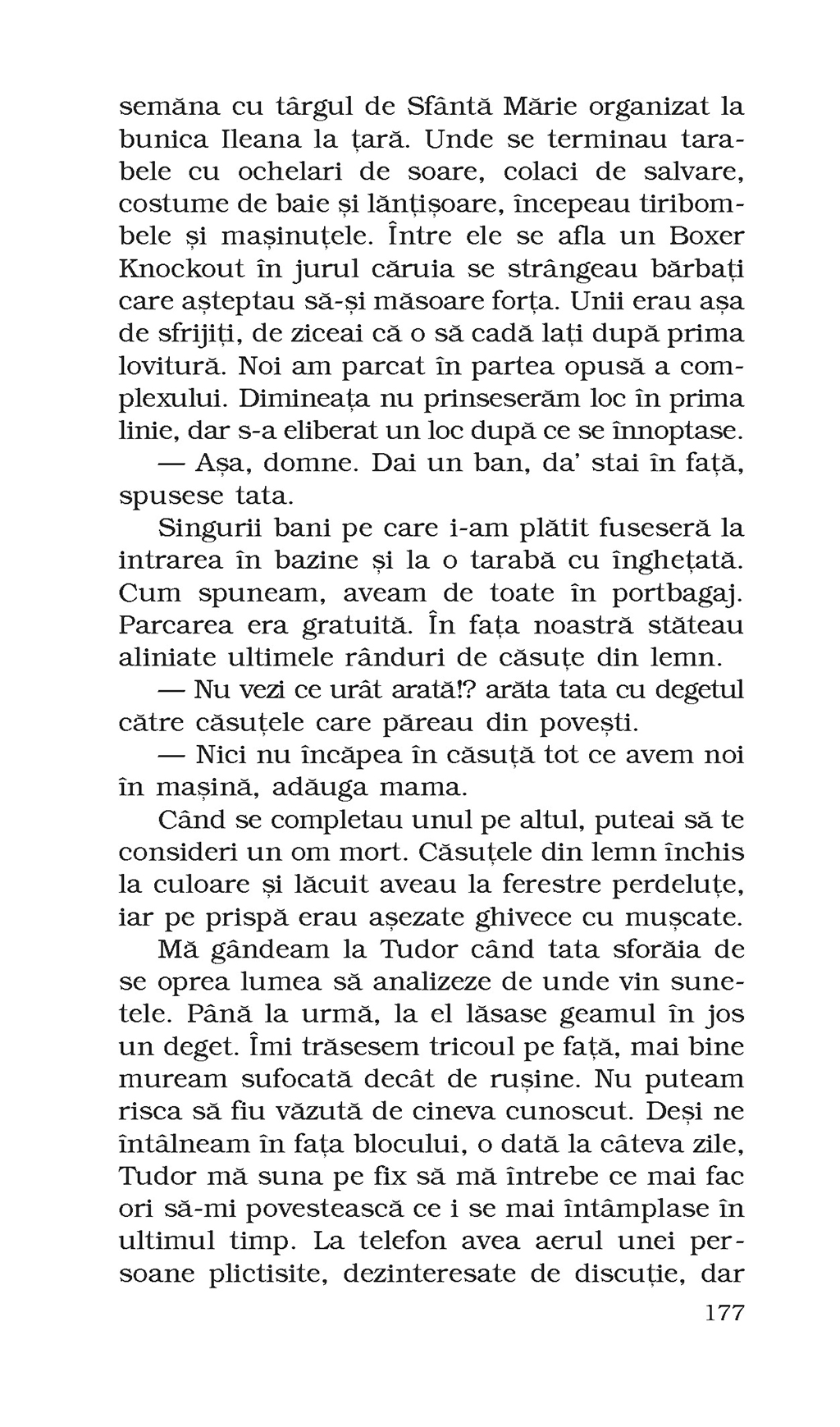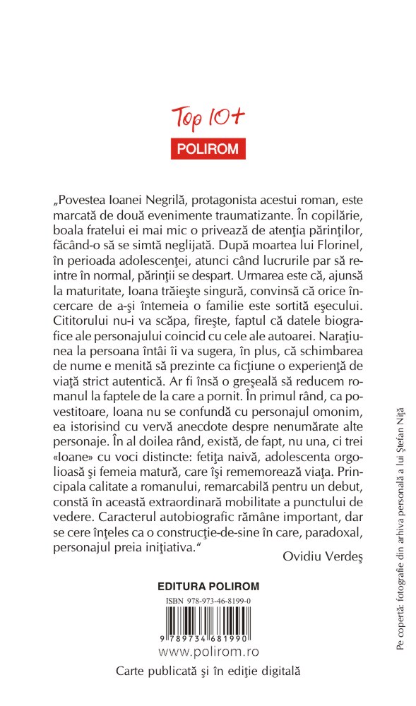 „Povestea Ioanei Negrilă, protagonista acestui roman, este marcată de două evenimente traumatizante. În copilărie, boala fratelui ei mai mic o privează de atenţia părinţilor, făcînd-o să se simtă neglijată. După moartea lui Florinel, în perioada adolescenţei, atunci cînd lucrurile par să reintre în normal, părinţii se despart. Urmarea este că, ajunsă la maturitate, Ioana trăieşte singură, convinsă că orice încercare de a-şi întemeia o familie este sortită eşecului. Cititorului nu-i va scăpa, fireşte, faptul că datele biografice ale personajului coincid cu cele ale autoarei. Naraţiunea la persoana întîi îi va sugera, în plus, că schimbarea de nume e menită să prezinte ca ficţiune o experienţă de viaţă strict autentică. Ar fi însă o greşeală să reducem romanul la faptele de la care a pornit. În primul rînd, ca povestitoare, Ioana nu se confundă cu personajul omonim, ea istorisind cu vervă anecdote despre nenumărate alte personaje. În al doilea rînd, există, de fapt, nu una, ci trei «Ioane» cu voci distincte: fetiţa naivă, adolescenta orgolioasă şi femeia matură, care îşi rememorează viaţa. Principala calitate a romanului, remarcabilă pentru un debut, constă în această extraordinară mobilitate a punctului de vedere. Caracterul autobiografic rămîne important, dar se cere înţeles ca o construcţie-de-sine în care, paradoxal, personajul preia iniţiativa.” (Ovidiu Verdeş)