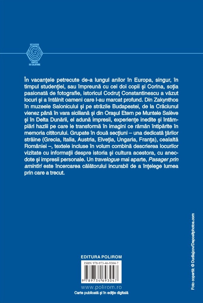 În vacanțele petrecute de-a lungul anilor în Europa, singur, în timpul studenției, sau împreună cu cei doi copii și Corina, soția pasionată de fotografie, istoricul Codruț Constantinescu a văzut locuri și a întâlnit oameni care l-au marcat profund. Din Zakynthos în muzeele Salonicului și pe străzile Budapestei, de la Crăciunul vienez până în vara siciliană și din Orașul Etern pe Muntele Salève și în Delta Dunării, el adună impresii, experiențe inedite și întâmplări hazlii pe care le transformă în imagini ce rămân întipărite în memoria cititorului. Grupate în două secțiuni – una dedicată țărilor străine (Grecia, Italia, Austria, Elveția, Ungaria, Franța), cealaltă României –, textele incluse în volum combină descrierea locurilor vizitate cu informații despre istoria și cultura acestora, cu anecdote și impresii personale. Un travelogue mai aparte, Pasager prin amintiri este încercarea călătorului incurabil de a înțelege lumea prin care a trecut.