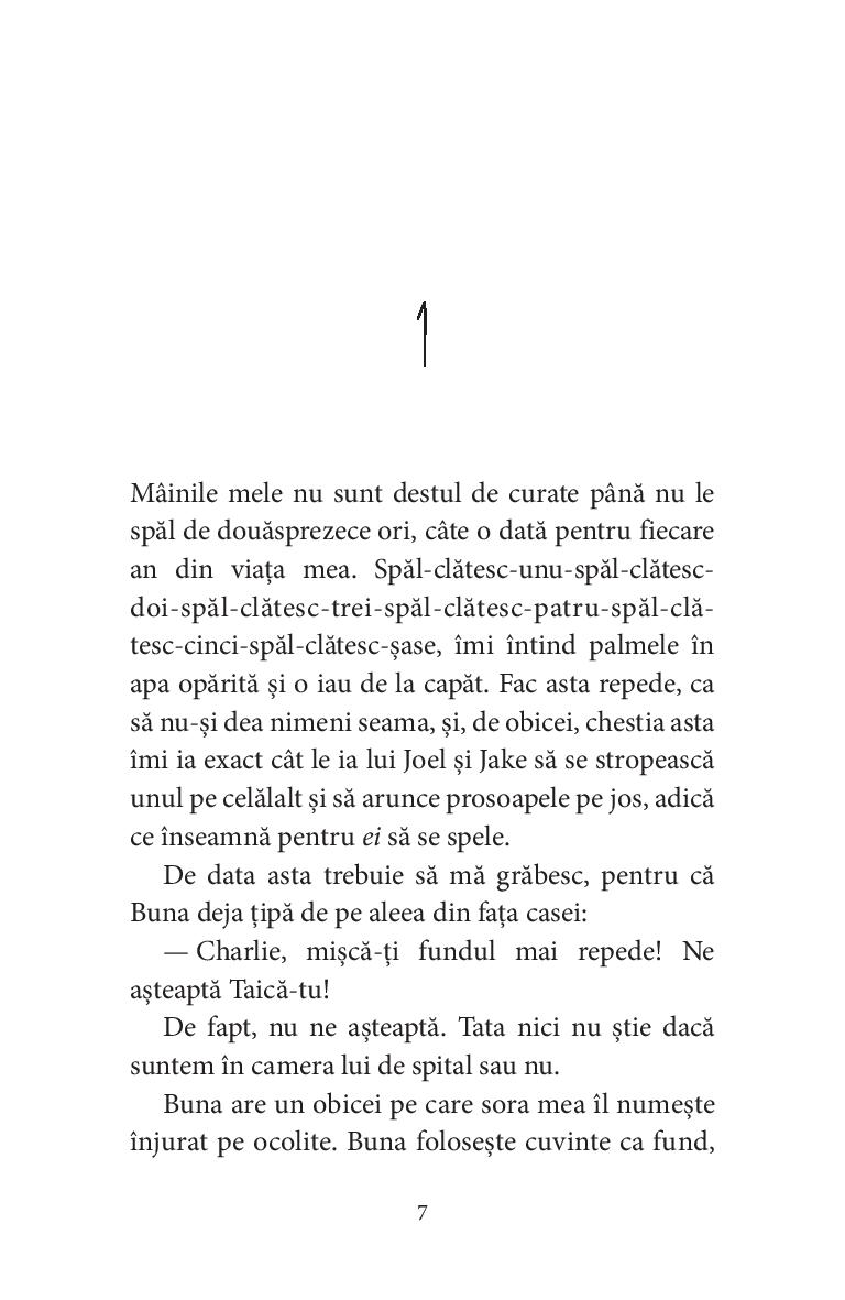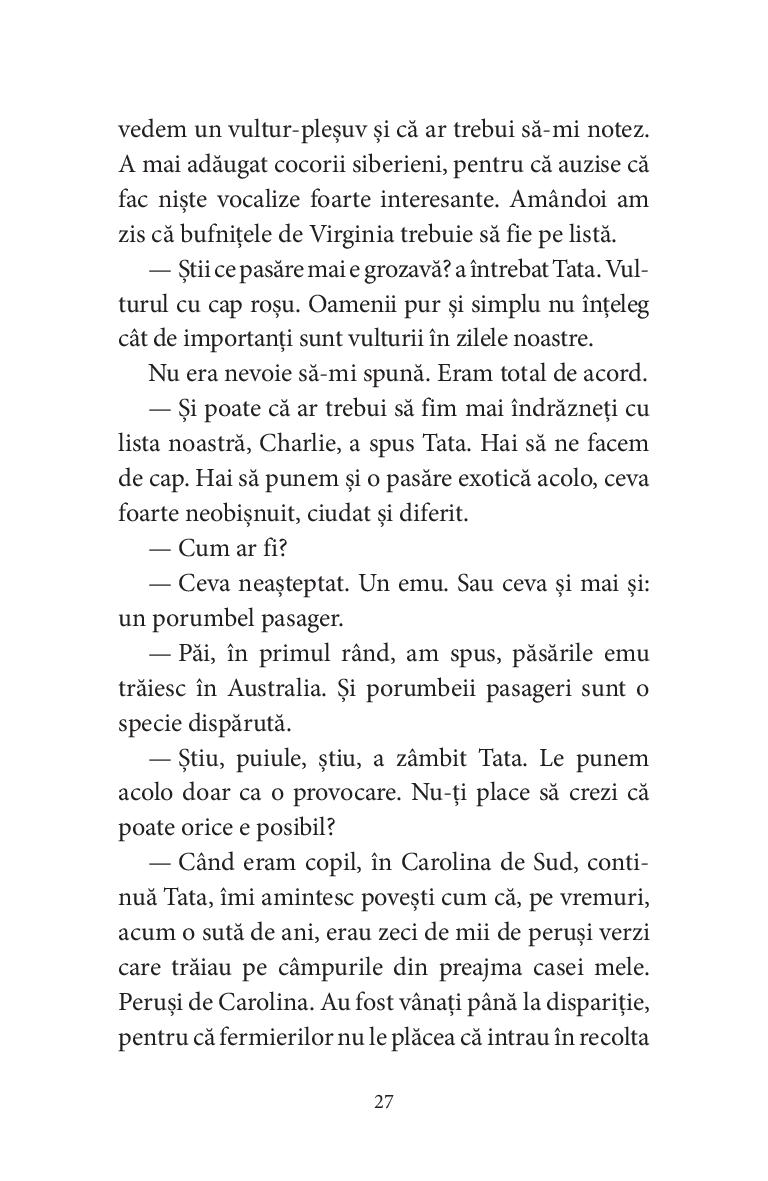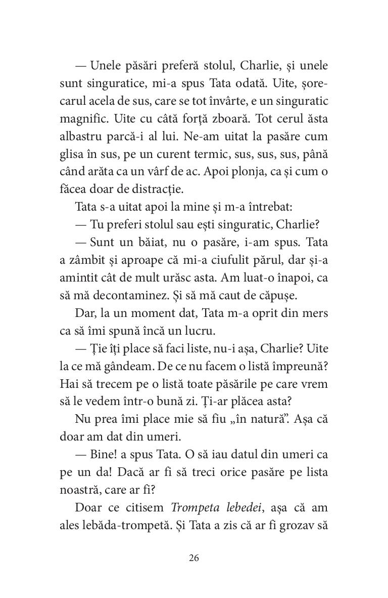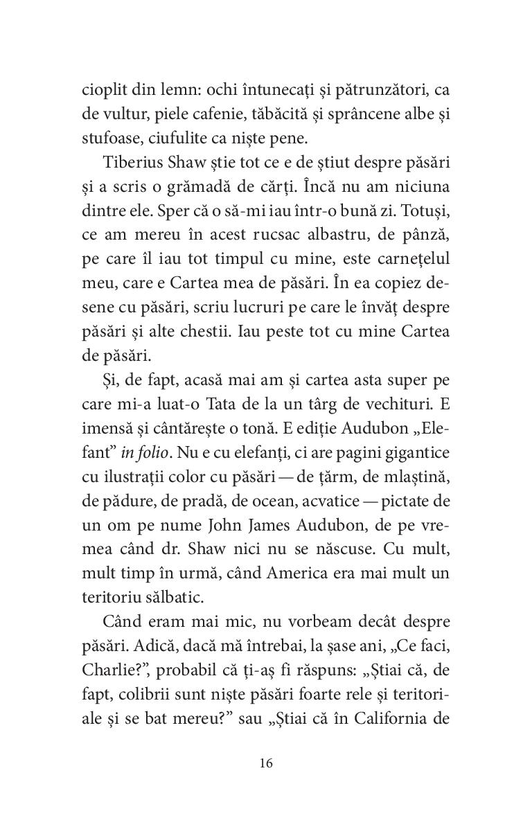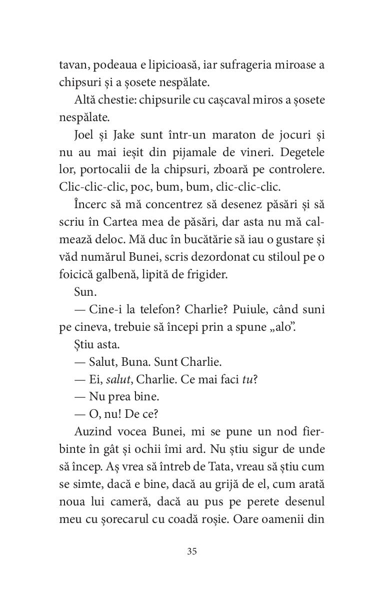 Camera lui Charlie e curată, caietele și creioanele stau aliniate frumos, iar el se simte bine și în siguranță urmându-si neabătut obiceiurile. Dar această viață perfect organizată este dată peste cap de când tatăl lui Charlie, reporter de război, s-a întors rănit din Afghanistan. Când doctorii decid că tatăl său trebuie mutat într-un spital din Virginia, Charlie, care este pasionat de păsări, acceptă să plece într-o lungă și solicitantă călătorie. Urăște călătoriile, dar știe că uneori e mai bine să zboare alături de stol, chiar când stolul e format din frații săi gemeni, obraznici și agitați, o soră mai mare, adolescentă, care e tot timpul cu ochii după băieți, și, apărută ca din senin, o ciudată care poartă o perucă liliachie.