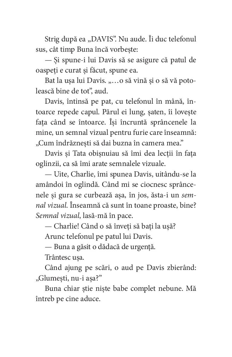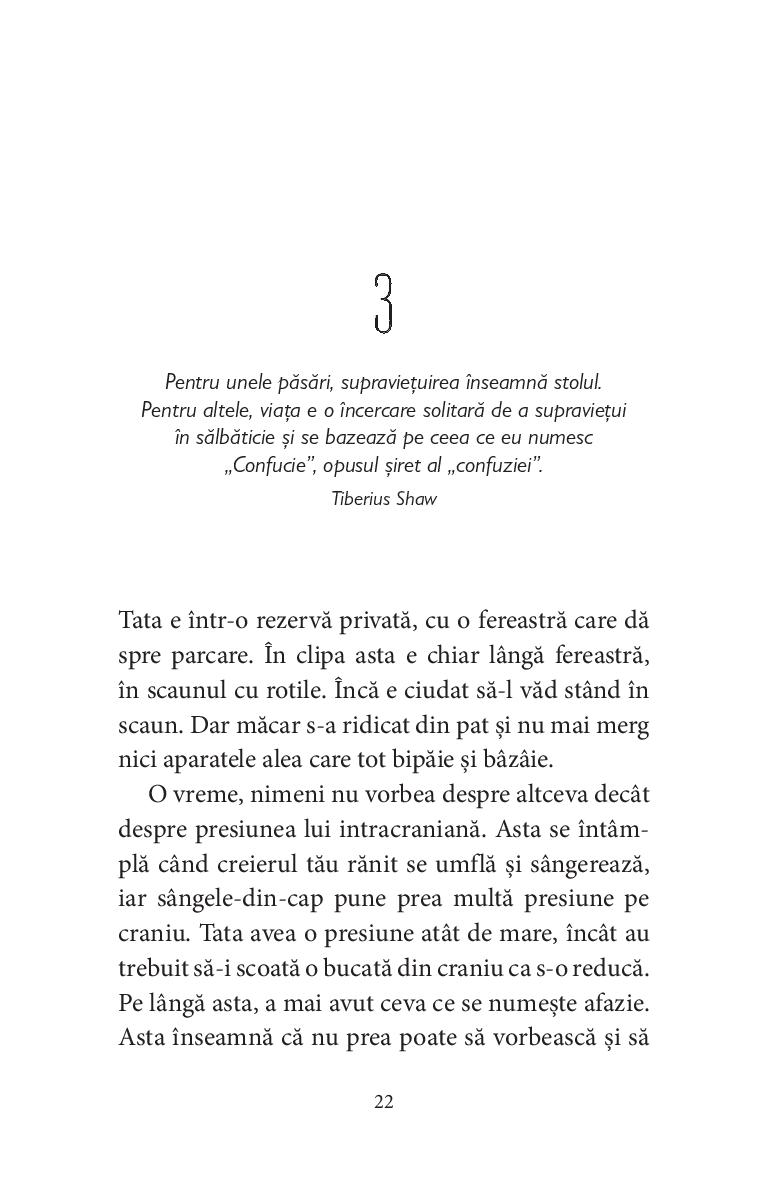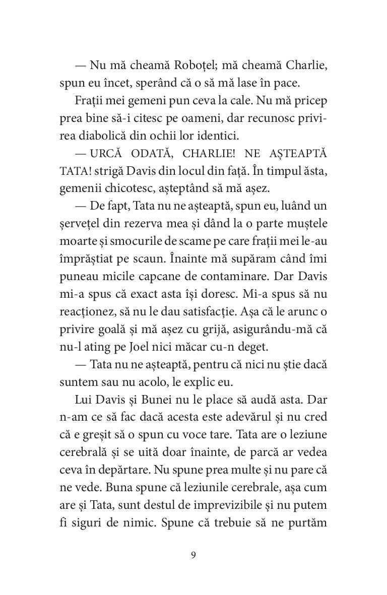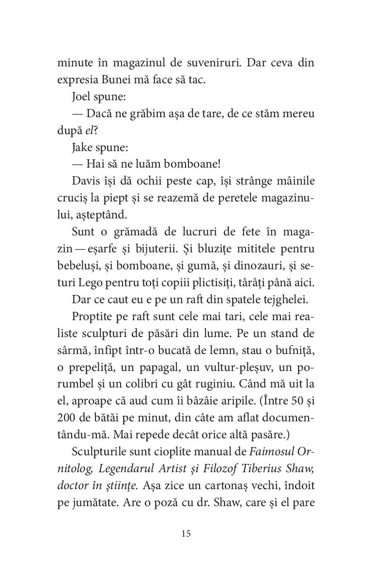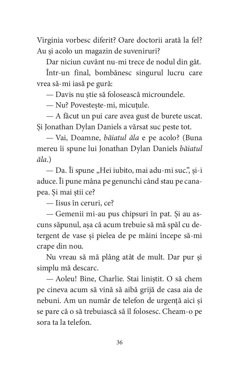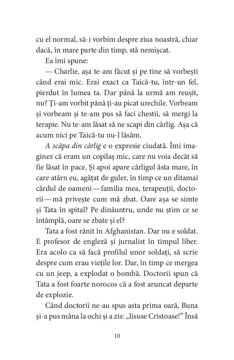 Camera lui Charlie e curată, caietele și creioanele stau aliniate frumos, iar el se simte bine și în siguranță urmându-si neabătut obiceiurile. Dar această viață perfect organizată este dată peste cap de când tatăl lui Charlie, reporter de război, s-a întors rănit din Afghanistan. Când doctorii decid că tatăl său trebuie mutat într-un spital din Virginia, Charlie, care este pasionat de păsări, acceptă să plece într-o lungă și solicitantă călătorie. Urăște călătoriile, dar știe că uneori e mai bine să zboare alături de stol, chiar când stolul e format din frații săi gemeni, obraznici și agitați, o soră mai mare, adolescentă, care e tot timpul cu ochii după băieți, și, apărută ca din senin, o ciudată care poartă o perucă liliachie.