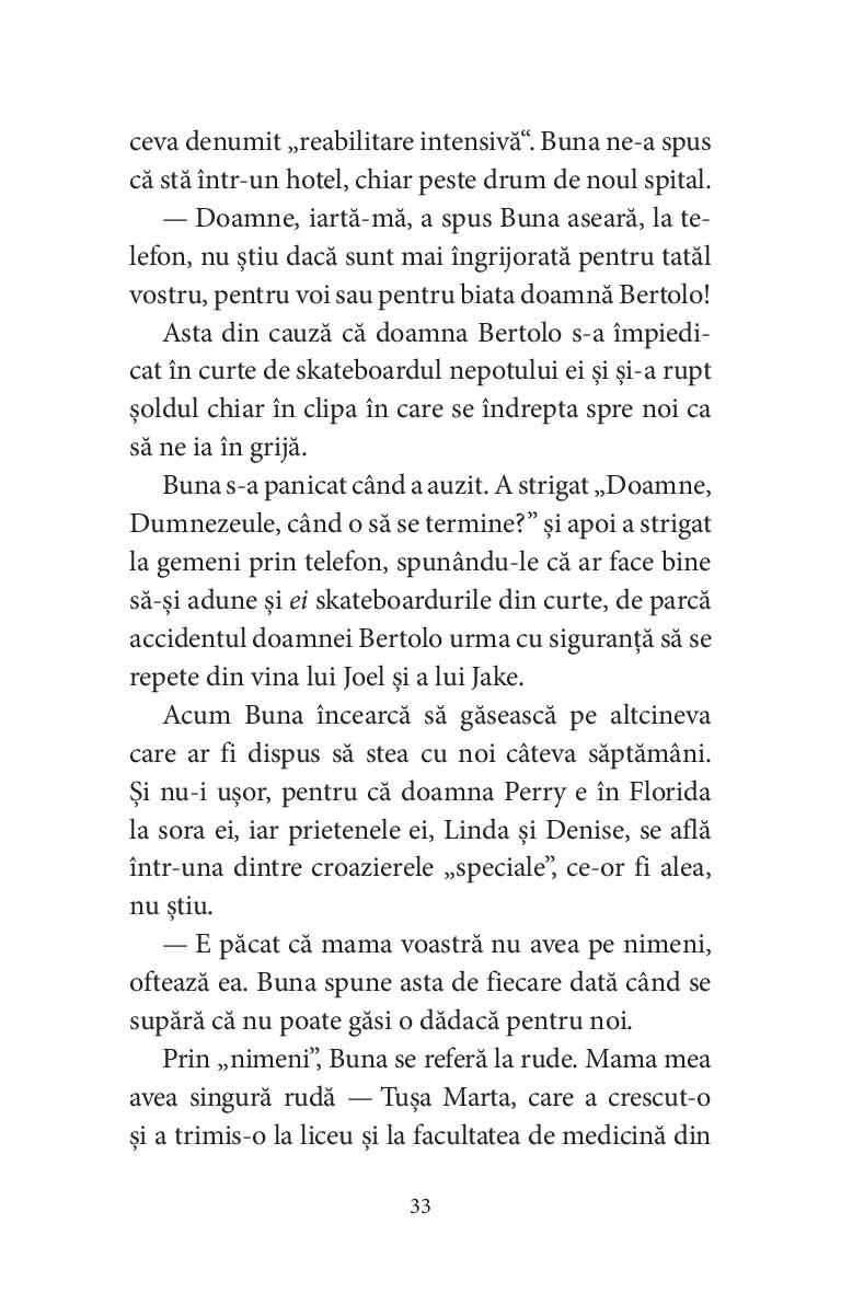 Păsările dintr-o bună zi e un roman pentru copii, și nu numai. Scris extraordinar, în parte ca o relatare a unei călătorii în compania unor țicniți, în parte ca un bildungsroman (roman al formării personalității, mai clar spus, ca la ora de română), este povestea unui copil care înțelege că stolul său este familia.