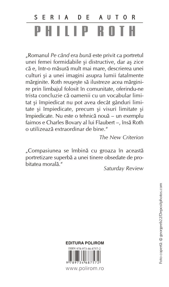 „Romanul Pe când era bună este privit ca portretul unei femei formidabile şi distructive, dar aş zice că e, într-o măsură mult mai mare, descrierea unei culturi şi a unei imagini asupra lumii fatalmente mărginite. Roth reuşeşte să ilustreze acea mărginire prin limbajul folosit în comunitate, oferindu-ne trista concluzie că oamenii cu un vocabular limitat şi împiedicat nu pot avea decât gânduri limitate şi împiedicate, precum şi visuri limitate şi împiedicate. Nu este o tehnică nouă – un exemplu faimos e Charles Bovary al lui Flaubert –, însă Roth o utilizează extraordinar de bine.” (The New Criterion)