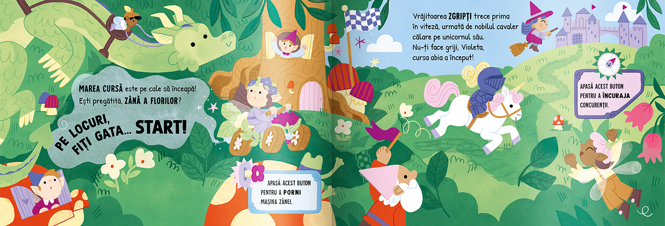 Cu ajutorul acestei cărți cea mică va interacționa cu personajele, angajându-se într-o cursă de mașini și ajutându-le să parcurgă traseul. Ea va învârti volanul și va apasă butoanele de pe bordul mașinii ca să ajungă prima la linia de sosire. Cartea conține o mulțime de sunete fascinante.