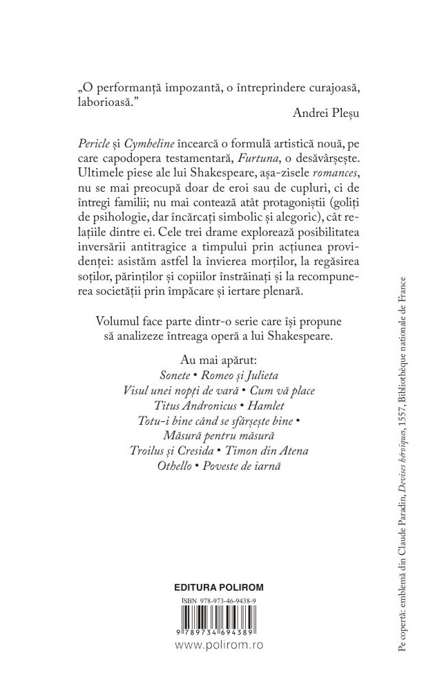 Pericle și Cymbeline încearcă o formulă artistică nouă, pe care capodopera testamentară, Furtuna, o desăvârșește. Ultimele piese ale lui Shakespeare, așa-zisele romances, nu se mai preocupă doar de eroi sau de cupluri, ci de întregi familii; nu mai contează atât protagoniștii (goliți de psihologie, dar încărcați simbolic și alegoric), cât relațiile dintre ei. Cele trei drame explorează posibilitatea inversării antitragice a timpului prin acțiunea providenței: asistăm astfel la învierea morților, la regăsirea soților, părinților și copiilor înstrăinați și la recompunerea societății prin împăcare și iertare plenară.
