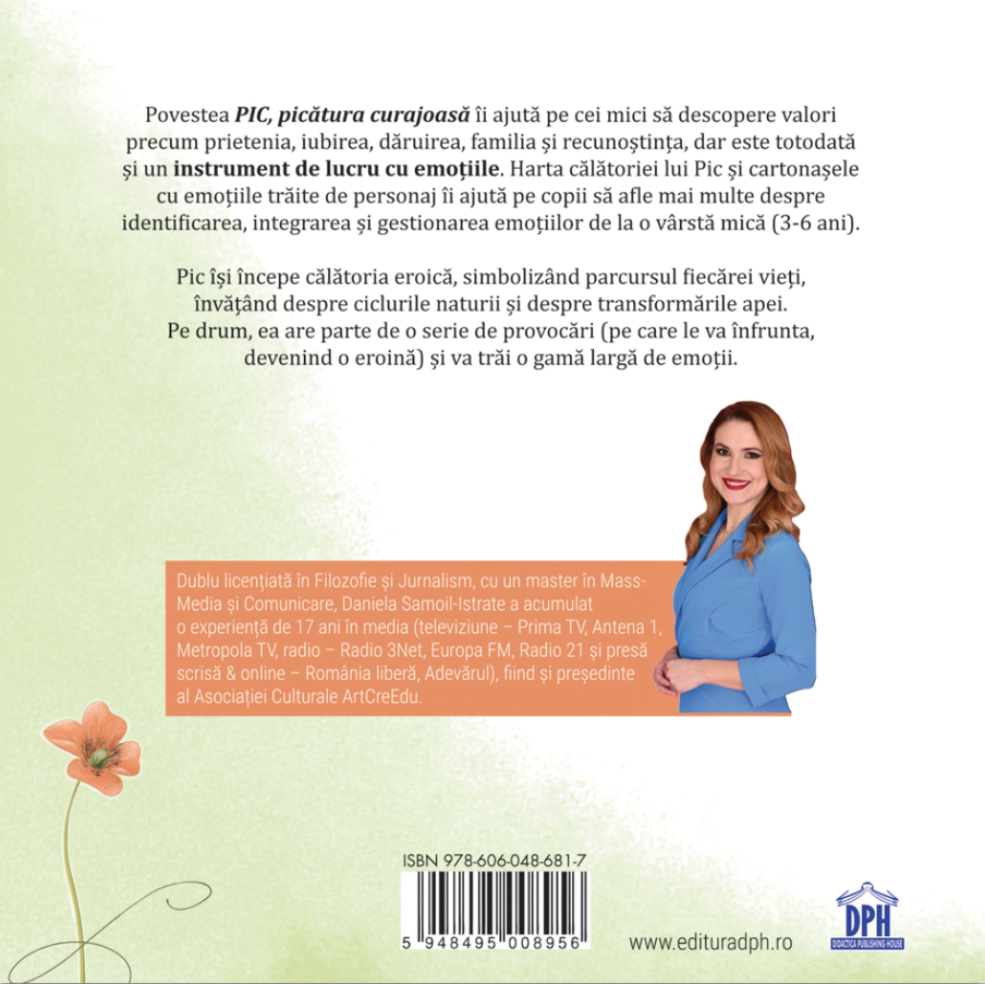 Povestea Pic, picătura curajoasă îi ajută pe copii să descopere valori precum prietenia, iubirea, dăruirea, familia și recunoștința, dar este și un instrument de lucru cu emoțiile. Harta călătoriei lui Pic și cartonașele cu emoțiile trăite de personaj îi ajută pe copii să afle mai multe despre identificarea, integrarea și gestionarea emoțiilor de la o vârstă mica (3 – 6 ani).