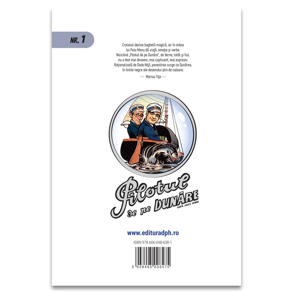 Creionul devine baghetă magică, iar în mâna lui Puiu Manu dă viață, emoție și vorbe. Nicicând “Pilotul de pe Dunăre”, de Verne, tatăl și fiul, nu a fost mai dinamic, mai captivant, mai expresiv. Raționalizată de Dodo Niță, povestirea curge ca Dunărea, în liniile negre ale desenului plin de culoare.