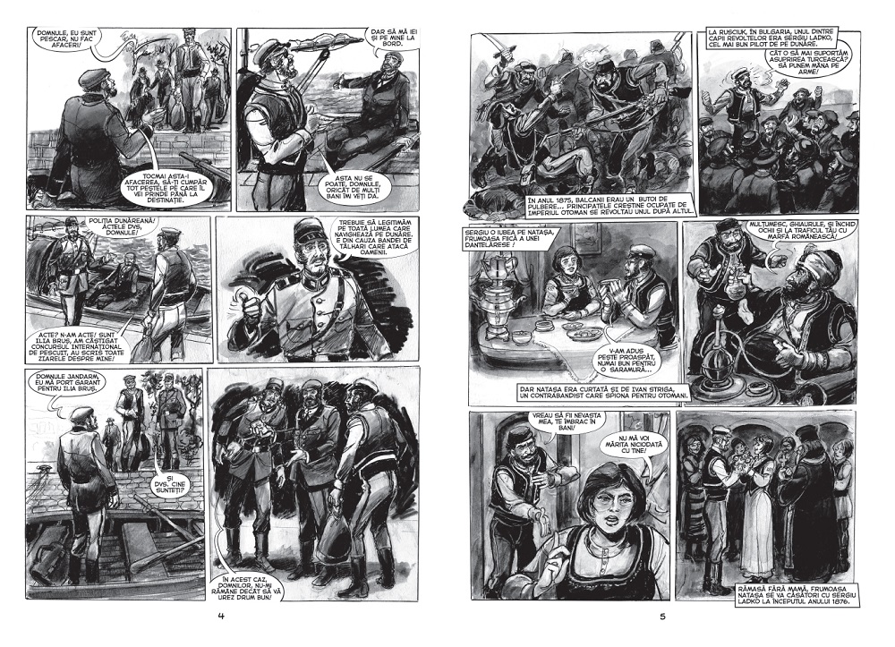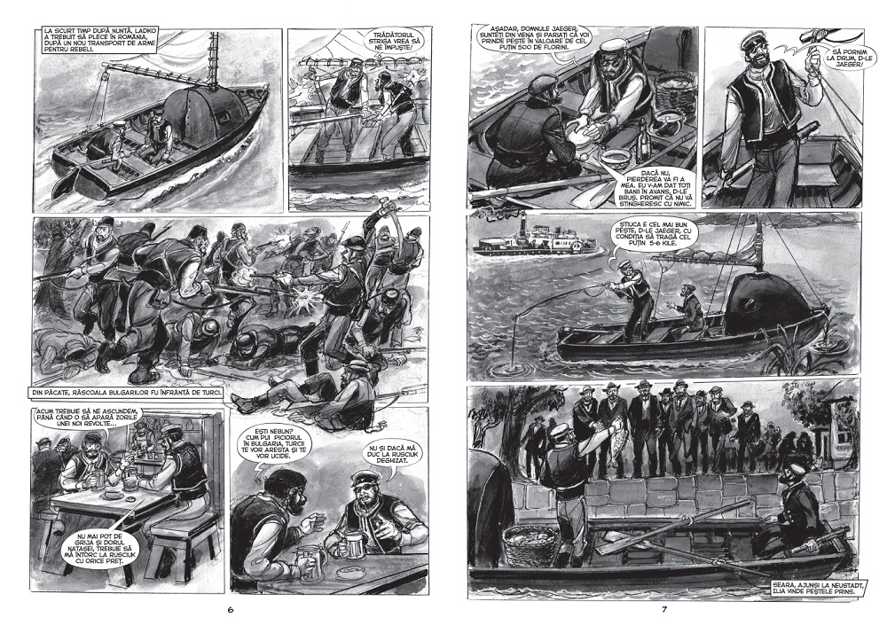 Dacă evenimentele din roman nu se prea pretează la zâmbete, Puiu Manu găsește ocazia, în această adaptare în bandă desenată optimistă și veselă, să arunce câte o rază de soare printre norii intrigii, folosindu-se de expresiile faciale și de limbajul corporal ale personajelor. E și ocazia să ne ofere priveliști pitorești de pe malurile Dunării, de la Sigmaringen la Galați, și să reia o temă dragă lui – navigația. Sunt sigur că ați citit deja Toate pânzele sus! sau aventurile lui Dim Dunăreanu, dar sunt mai puțin sigur că știți un secret – Puiu Manu a făcut iahting de performanță, învățând tainele sportului pe… lacul Herăstrău. Are chiar și titlul de campion al României.