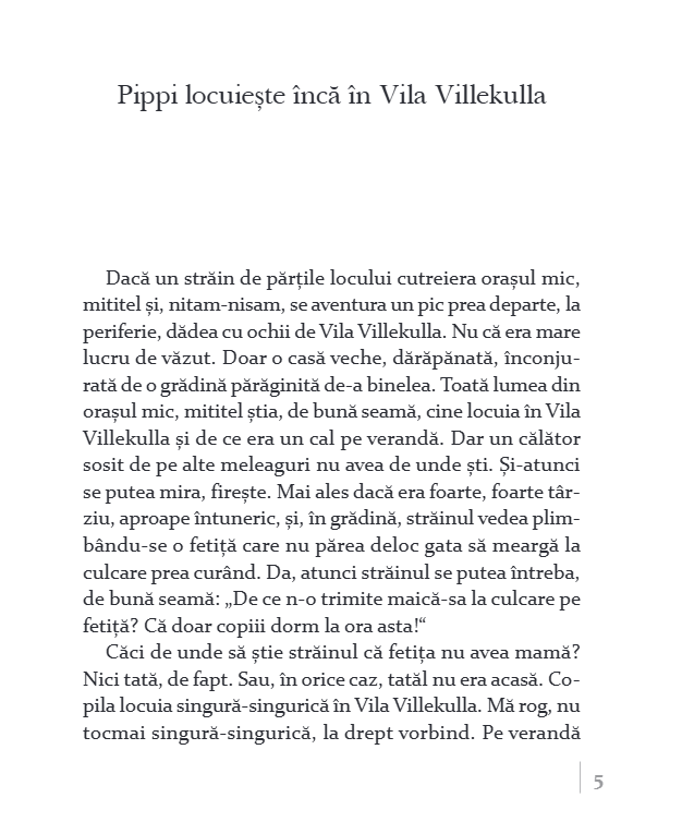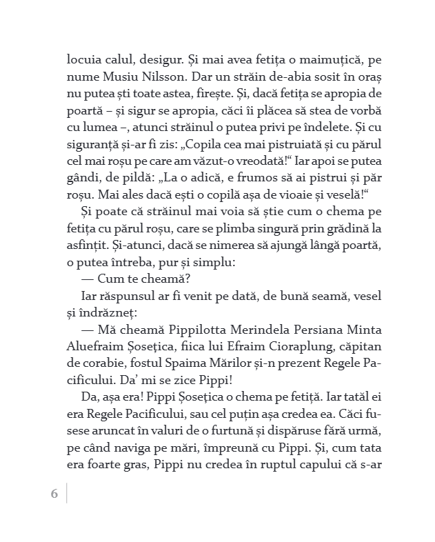 Cu părul roşu ca morcovul, strâns în două cozi ţepene, pistruiată şi cu gura până la urechi, cu ciorapi desperecheaţi şi cu pantofi în care ar putea încăpea încă o pereche de picioare, fetiţa de nouă ani e o apariţie remarcabilă.