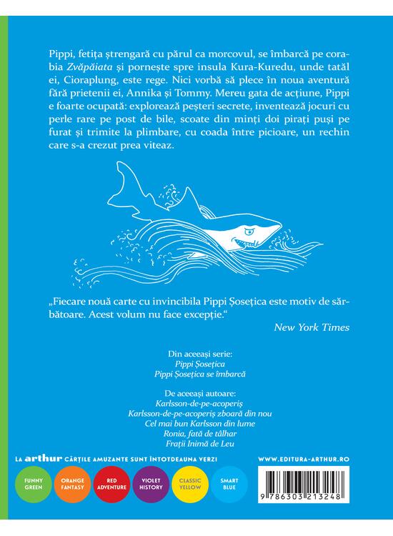 Mereu gata de acțiune, Pippi e foarte ocupată: explorează peșteri secrete, inventează jocuri cu perle rare pe post de bile, scoate din minți doi pirați puși pe furat și trimite la plimbare, cu coada între picioare, un rechin care s-a crezut prea viteaz.
