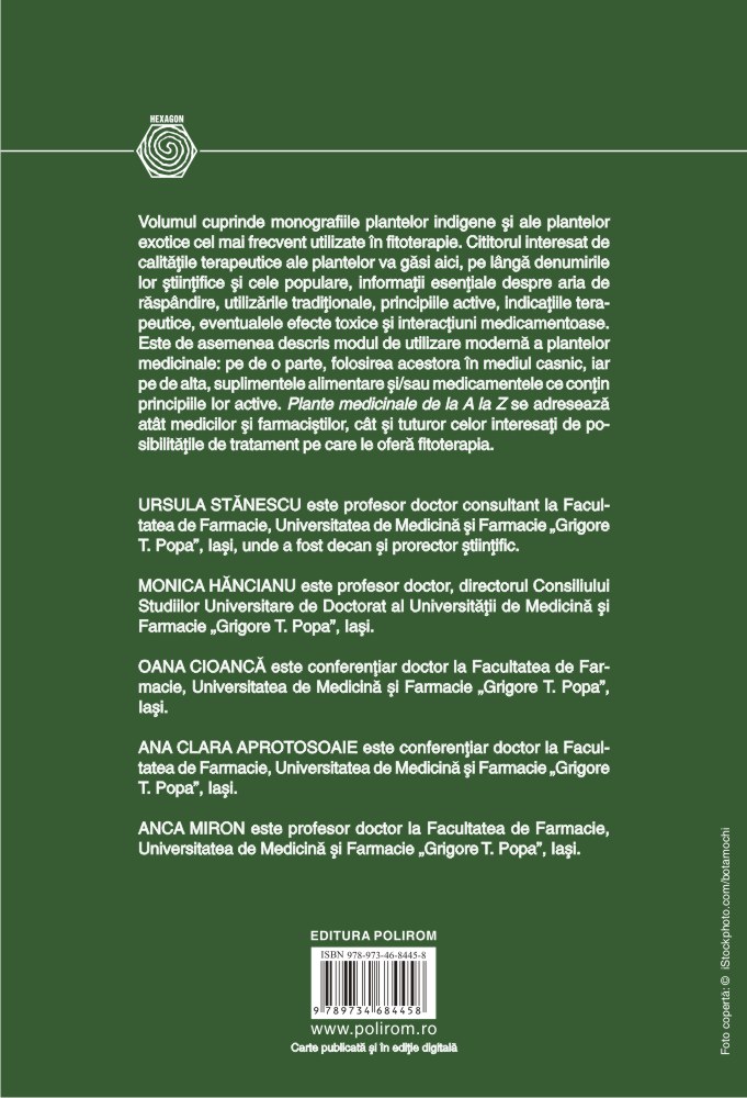 Volumul cuprinde monografiile plantelor indigene și ale plantelor exotice cel mai frecvent utilizate în fitoterapie. Cititorul interesat de calitățile terapeutice ale plantelor va găsi aici, pe lîngă denumirile lor științifice și cele populare, informații esențiale despre aria de răspîndire, utilizările tradiționale, principiile active, indicațiile terapeutice, eventualele efecte toxice și interacțiuni medicamentoase. Este de asemenea descris modul de utilizare modernă a plantelor medicinale: pe de o parte, folosirea acestora în mediul casnic, iar pe de alta, suplimentele alimentare și/sau medicamentele ce conțin principiile lor active. Plante medicinale de la A la Z se adresează atît medicilor și farmaciștilor, cît și tuturor celor interesați de posibilitățile de tratament pe care le oferă fitoterapia.