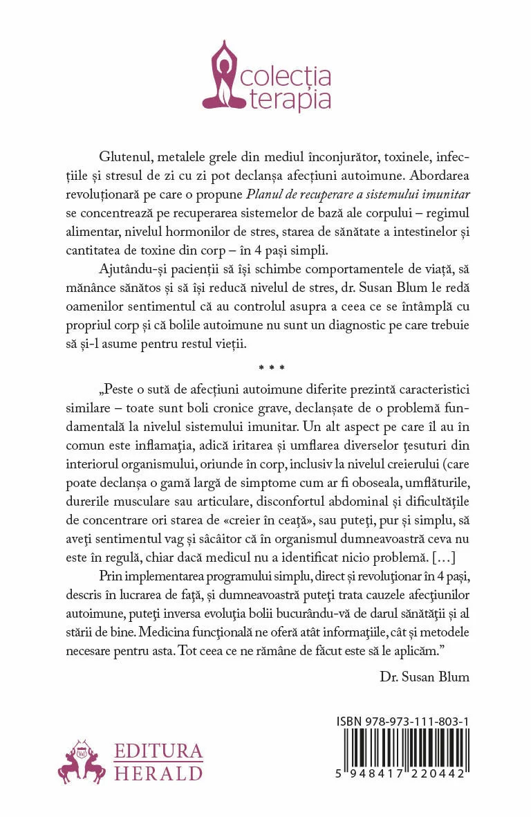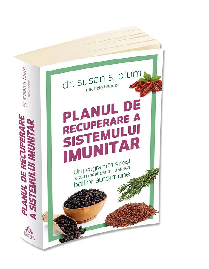 Glutenul, metalele grele din mediul inconjurator, toxinele, infectiile si stresul de zi cu zi pot declansa afectiuni autoimune. Abordarea revolutionara pe care o propune Planul de recuperare a sistemului imunitar se concentreaza pe recuperarea sistemelor de baza ale corpului – regimul alimentar, nivelul hormonilor de stres, starea de sanatate a intestinelor si cantitatea de toxine din corp – in 4 pasi simpli. Ajutandu-si pacientii sa isi schimbe comportamentele de viata, sa manance sanatos si sa isi reduca nivelul de stres, dr. Susan Blum le reda oamenilor sentimentul ca au controlul asupra a ceea ce se intampla cu propriul corp si ca bolile autoimune nu sunt un diagnostic pe care trebuie sa si-l asume pentru restul vietii.