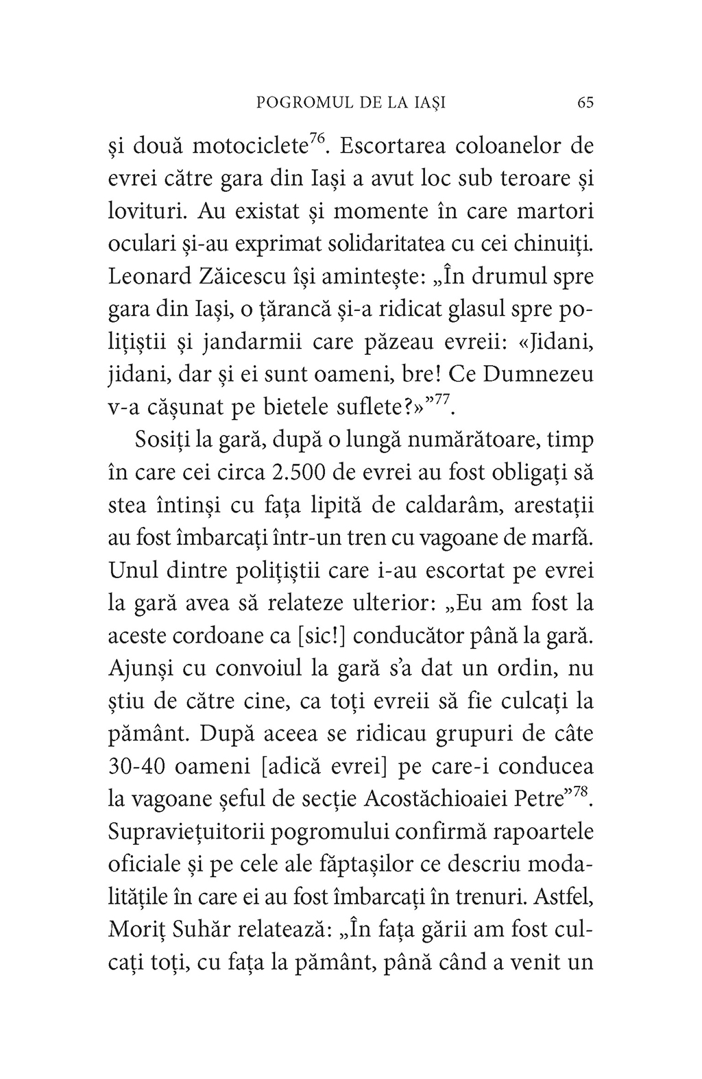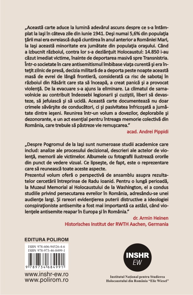 „Această carte aduce la lumină adevărul ascuns despre ce s-a întîmplat la Iaşi în cîteva zile din iunie 1941. Deşi numai 5,6% din populaţia ţării mai era evreiască după ciuntirea în anul anterior a României Mari, la Iaşi această minoritate era jumătate din populaţia oraşului. Cînd a izbucnit războiul, contra lor s-a dezlănţuit Holocaustul: 14.850 i-au căzut imediat victime, înainte de deportarea masivă spre Transnistria. Într-o societate în care antisemitismul îmbibase viaţa curentă şi era înteţit zilnic de presă, decizia militară de a deporta peste noapte această masă de evrei de lîngă frontieră, considerată ca risc de sabotaj în războiul din Răsărit care sta să înceapă, a creat panică şi a provocat violenţă. De la evacuare s-a ajuns la eliminare. La climatul de samavolnicie au contribuit îndeosebi legionarii şi cuziştii, liberi să devasteze, să jefuiască şi să ucidă. Această carte documentează nu doar crimele săvîrşite de conducători, ci şi pasivitatea înfricoşată a jumătate dintre ieşeni. Reunirea într-un volum a dovezilor, deplorabile şi dezonorante, e un act esenţial pentru întreaga memorie colectivă din România, care trebuie să păstreze vie remuşcarea.” (acad. Andrei Pippidi)