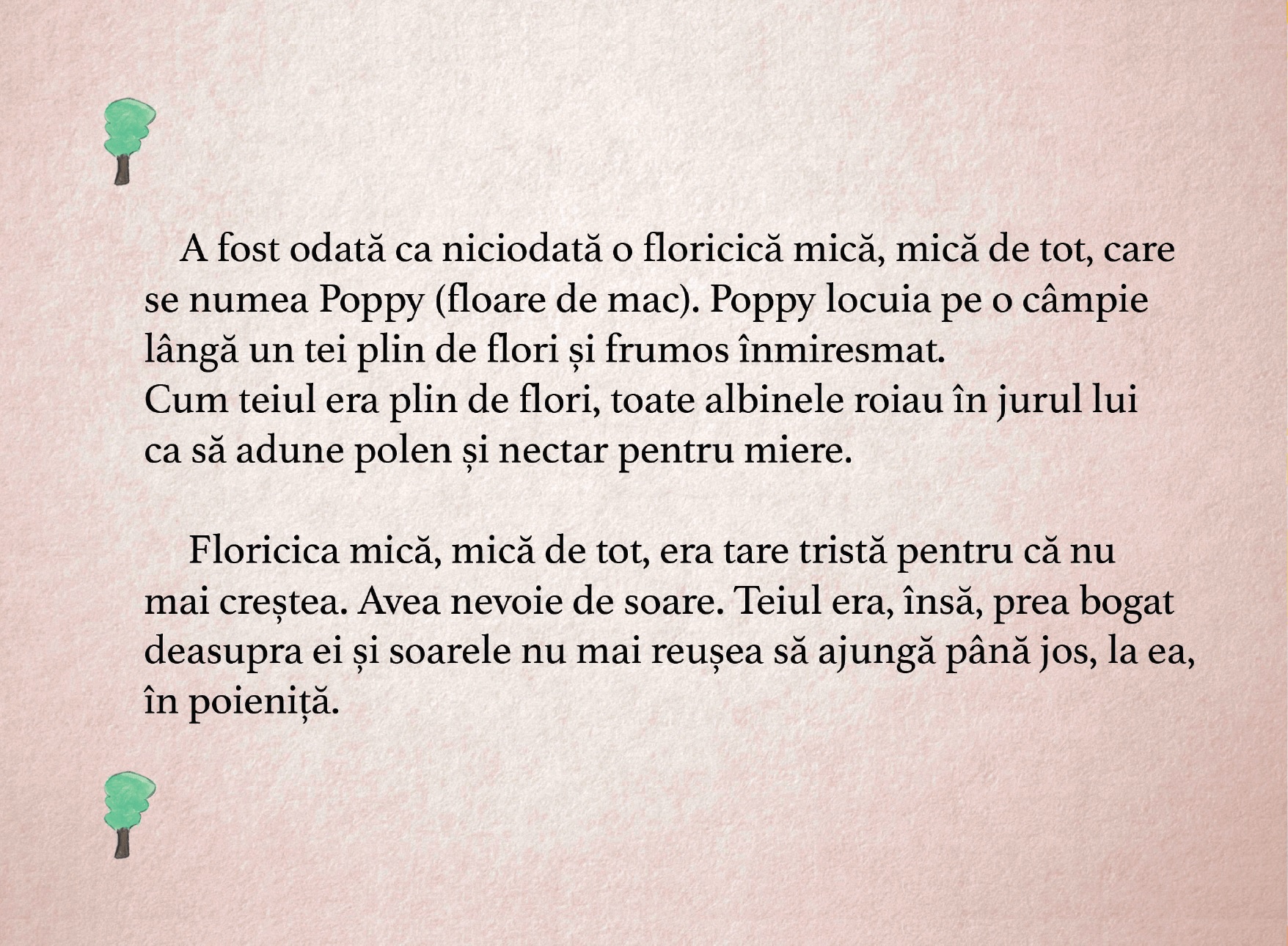 Poppy este povestea unei flori de mac care nu putea să crească deoarece avea nevoie de razele soarelui. O albinuță o va ajuta și va deveni prietena ei cea mai bună.