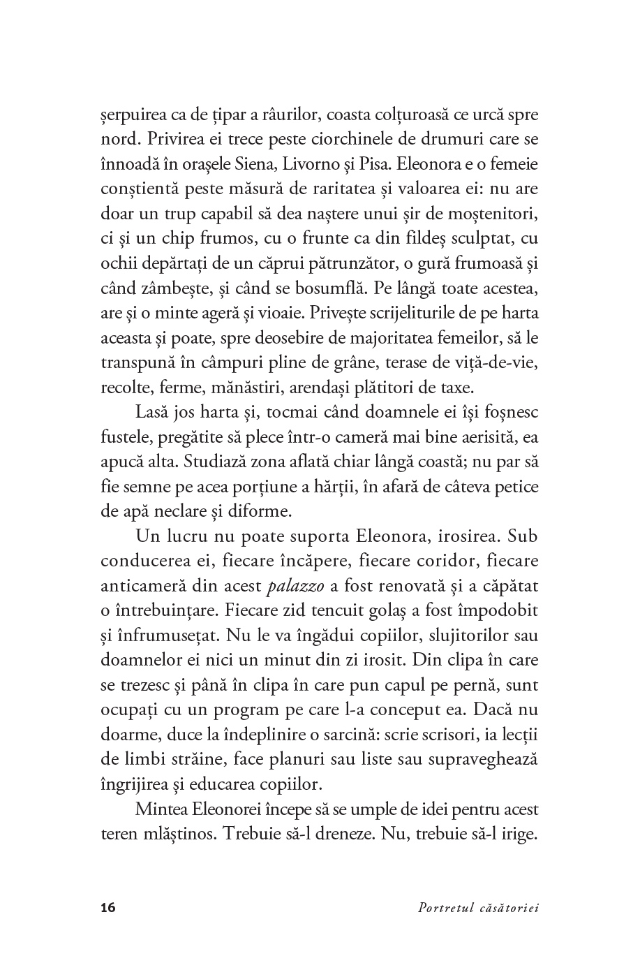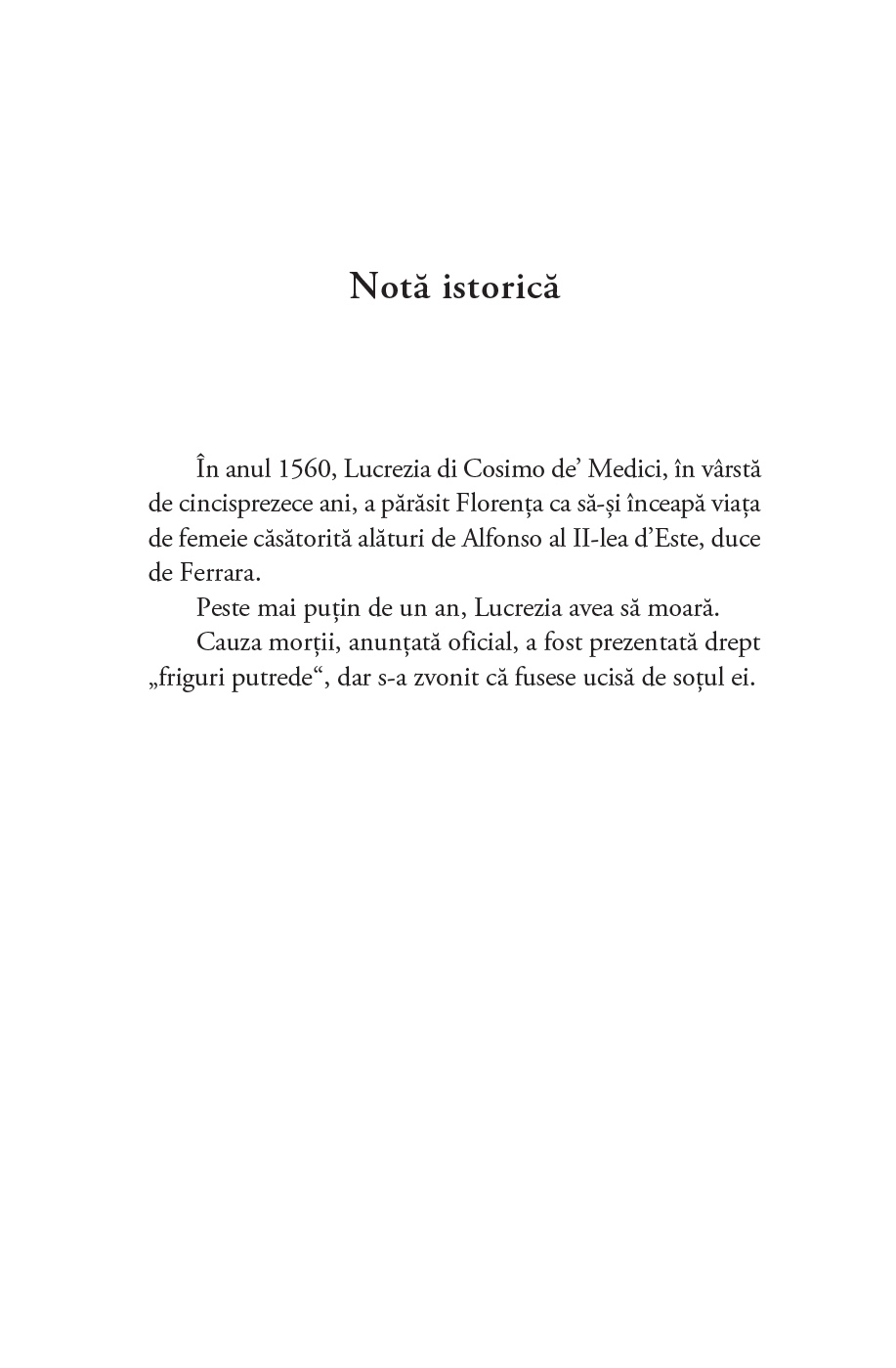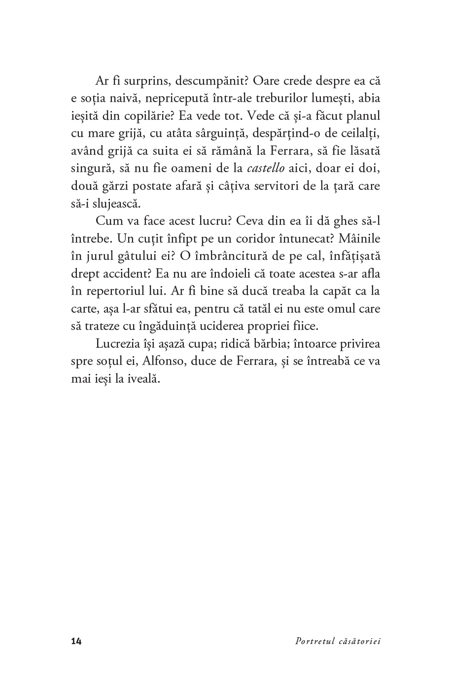 Măritată peste noapte cu Alfonso d’Este, duce de Ferrara, Modena și Reggio, Lucrezia părăsește Florența natală pentru a trăi la o curte străină ale cărei obiceiuri îi par stranii și unde prezența ei nu este tocmai dorită. Chiar și soțul ei pare o enigmă: este fie un estet înconjurat de artiști, fie un despot în fața căruia tremură și propriile-i rude. În timp ce pozează la nesfârșit pentru un portret menit a-i surprinde frumusețea pentru eternitate, Lucrezia înțelege că în ochii curții ea nu îndeplinește decât rolul de mamă a viitoarei dinastii din Ferrara.