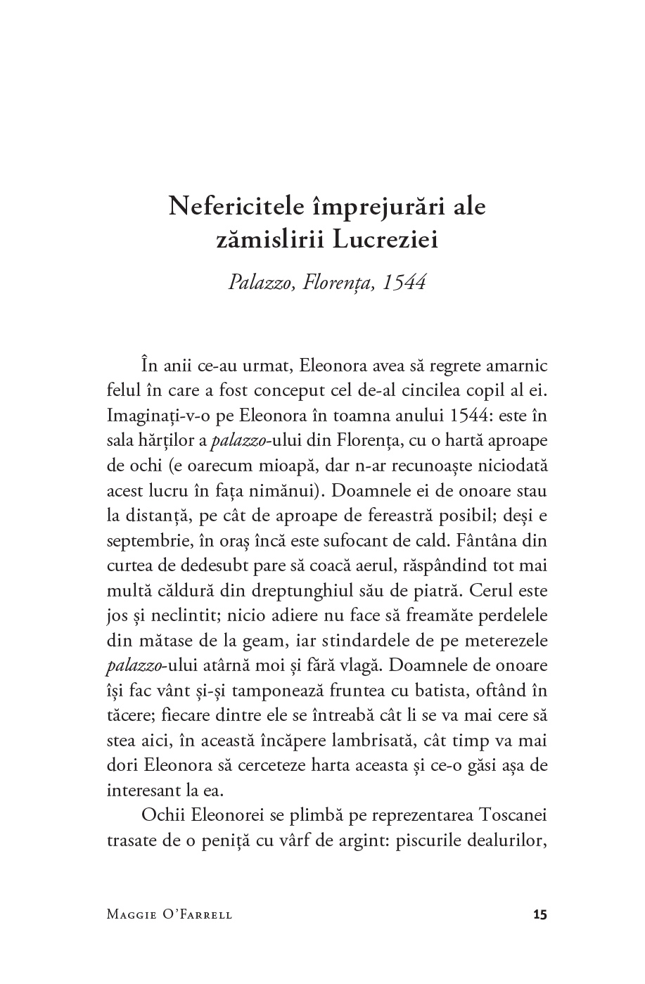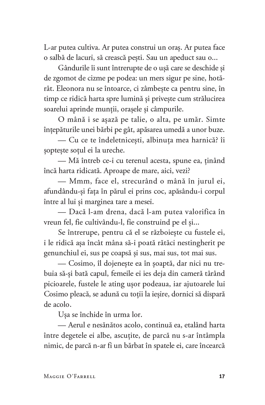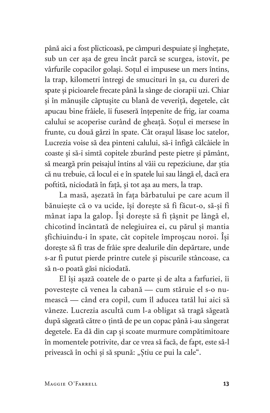 Prozatoarea irlandeză Maggie O’Farrell (n. 1972) este autoarea a nouă romane. A câștigat prestigioasele Betty Trask Award (pentru romanul After You’d Gone, 2000), Somerset Maugham Award (pentru The Distance Between Us, 2004) și Costa Book Award (pentru The Hand That First Held Mine, 2010). Pentru romanul Hamnet (2020; Pandora M, 2021) a fost recompensată cu National Book Critics Circle Award for Fiction și Women’s Prize for Fiction. Cărțile ei sunt traduse în mai bine de 30 de limbi. Trăiește la Edinburgh, alături de soțul ei, scriitorul William Sutcliffe, și de cei trei copii ai lor. Volumul de memorii I Am, I Am, I Am (2017; Exist, exist, exist, Pandora M, 2022) s-a numărat printre finaliștii la Women's Prize for Fiction.