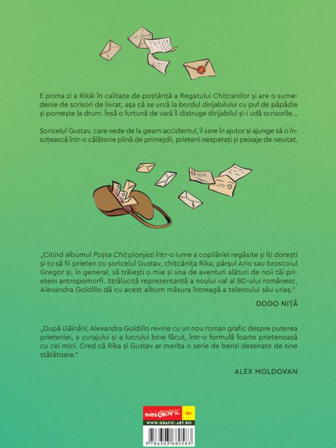 „Citind albumul Poșta Chiț plonjezi într-o lume a copilăriei regăsite și îți dorești și tu să fii prieten cu șoricelul Gustav, chițcănița Rika, pârșul Arlo sau broscoiul Gregor și, în general, să trăiești o mie și una de aventuri alături de noii tăi prieteni antropomorfi.