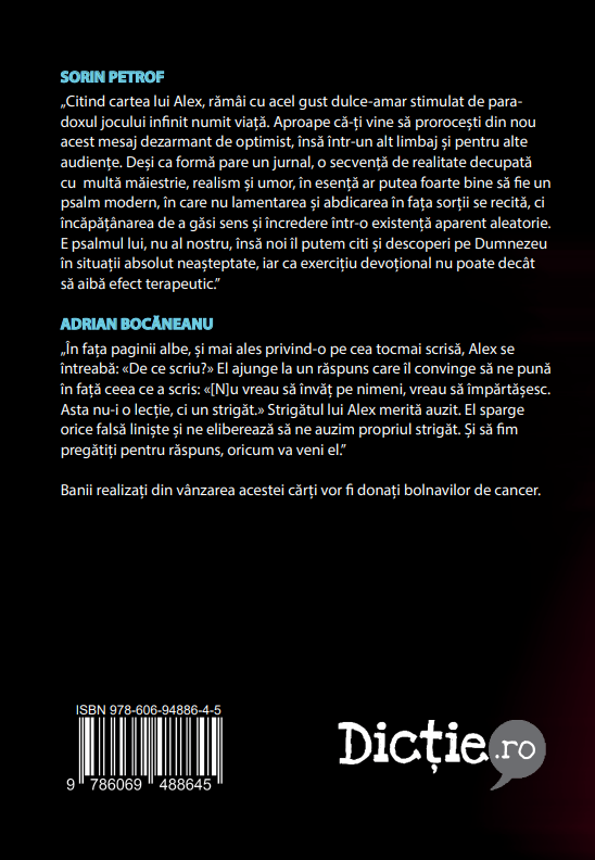 „Citind cartea lui Alex, rămâi cu acel gust dulce-amar stimulat de paradoxul jocului infinit numit viaţă. Aproape că-ţi vine să proroceşti din nou acest mesaj dezarmant de optimist, însă intr-un alt limbaj şi pentru alte audienţe. Deşi ca formă pare un jumal, o secvenţă de realitate decupată cu multă măiestrie, realism şi umor, în esenţă ar putea foarte bine să fie un psalm modern, in care nu lamentarea şi abdicarea in faţa sorţii se recită, ci încăpâţânarea de a găsi sens şi încredere într-o existenţă aparent aleatorie. E psalmul lui, nu al nostru, însă noi il putem citi şi descoperi pe Dumnezeu in situaţii absolut neaşteptate, iar ca exerciţiu devoţional nu poate decât să aibă efect terapeutic.”