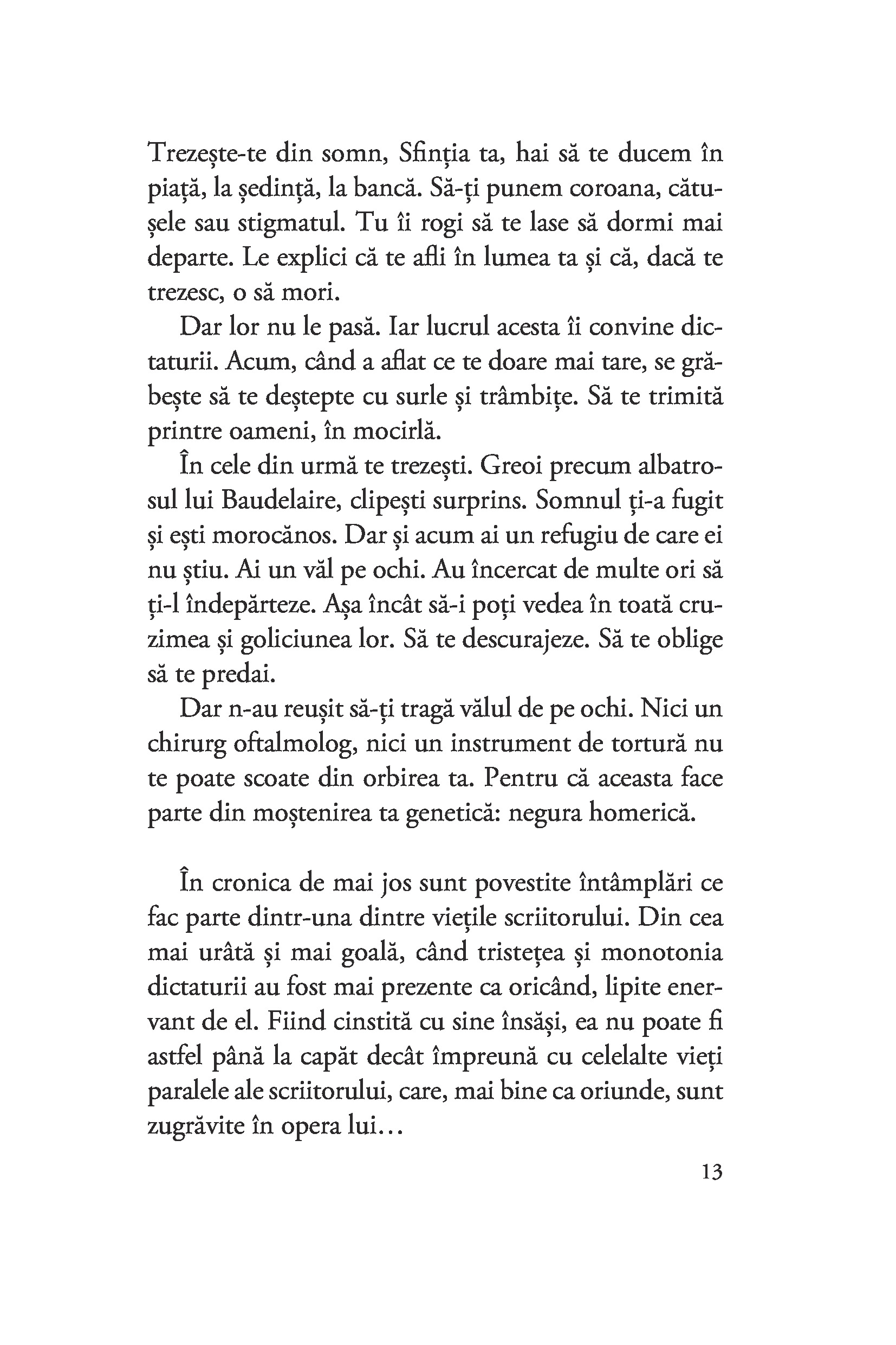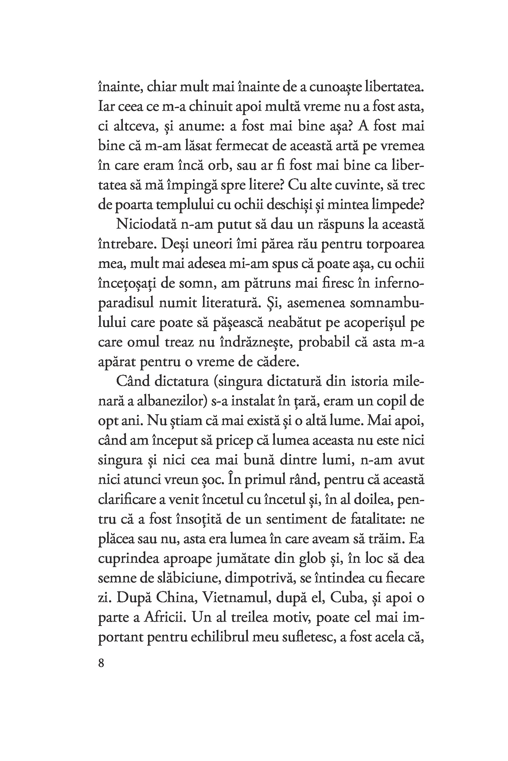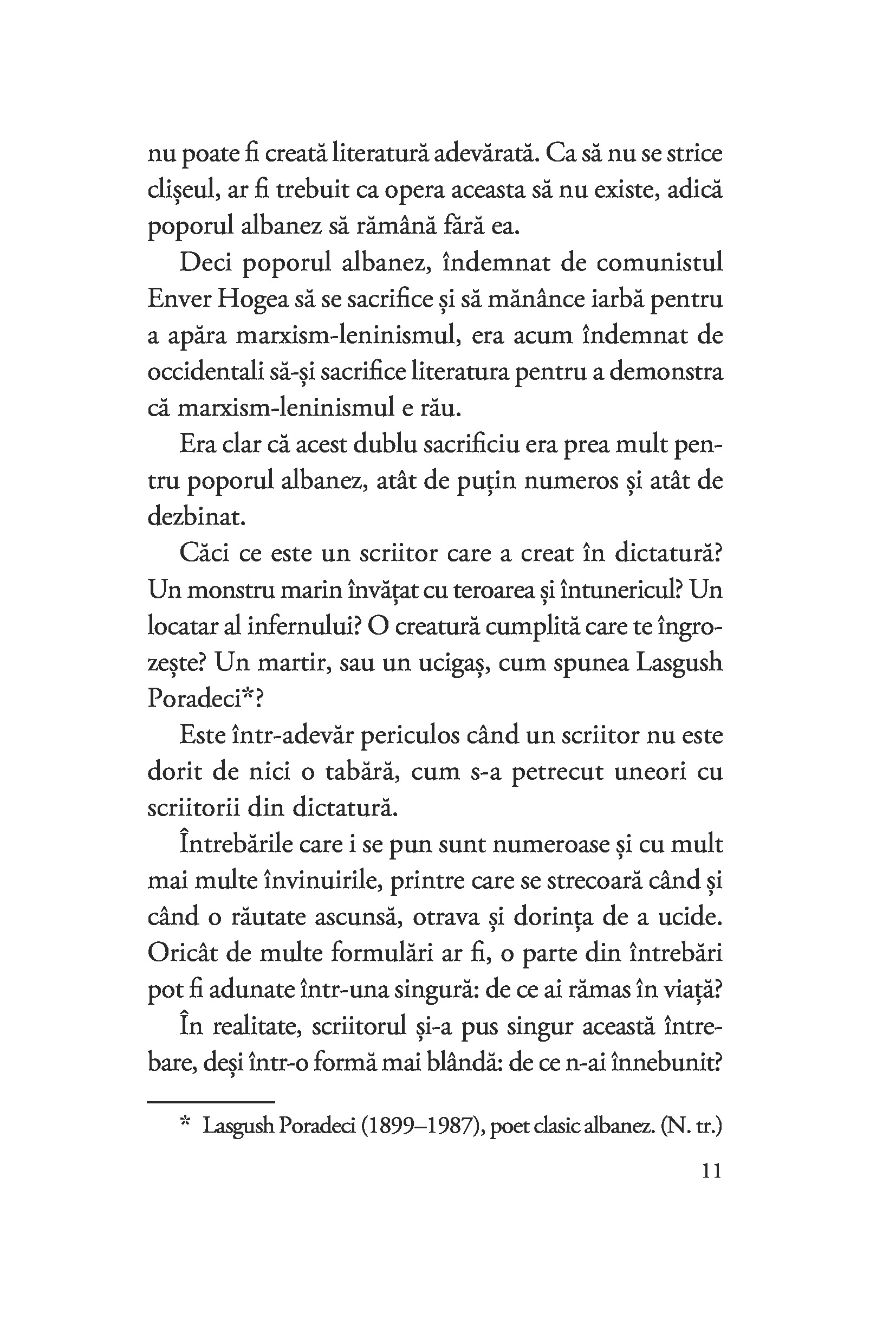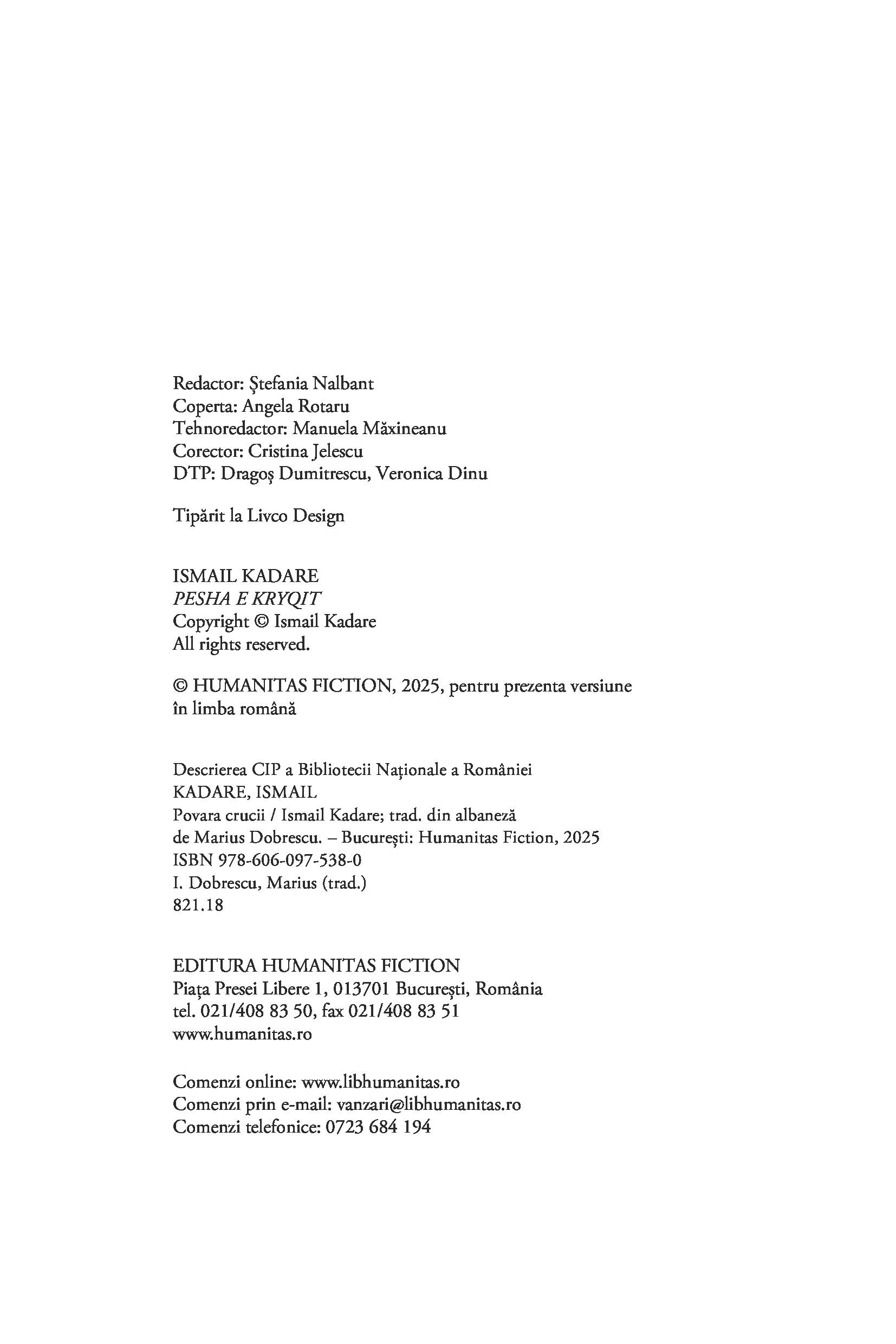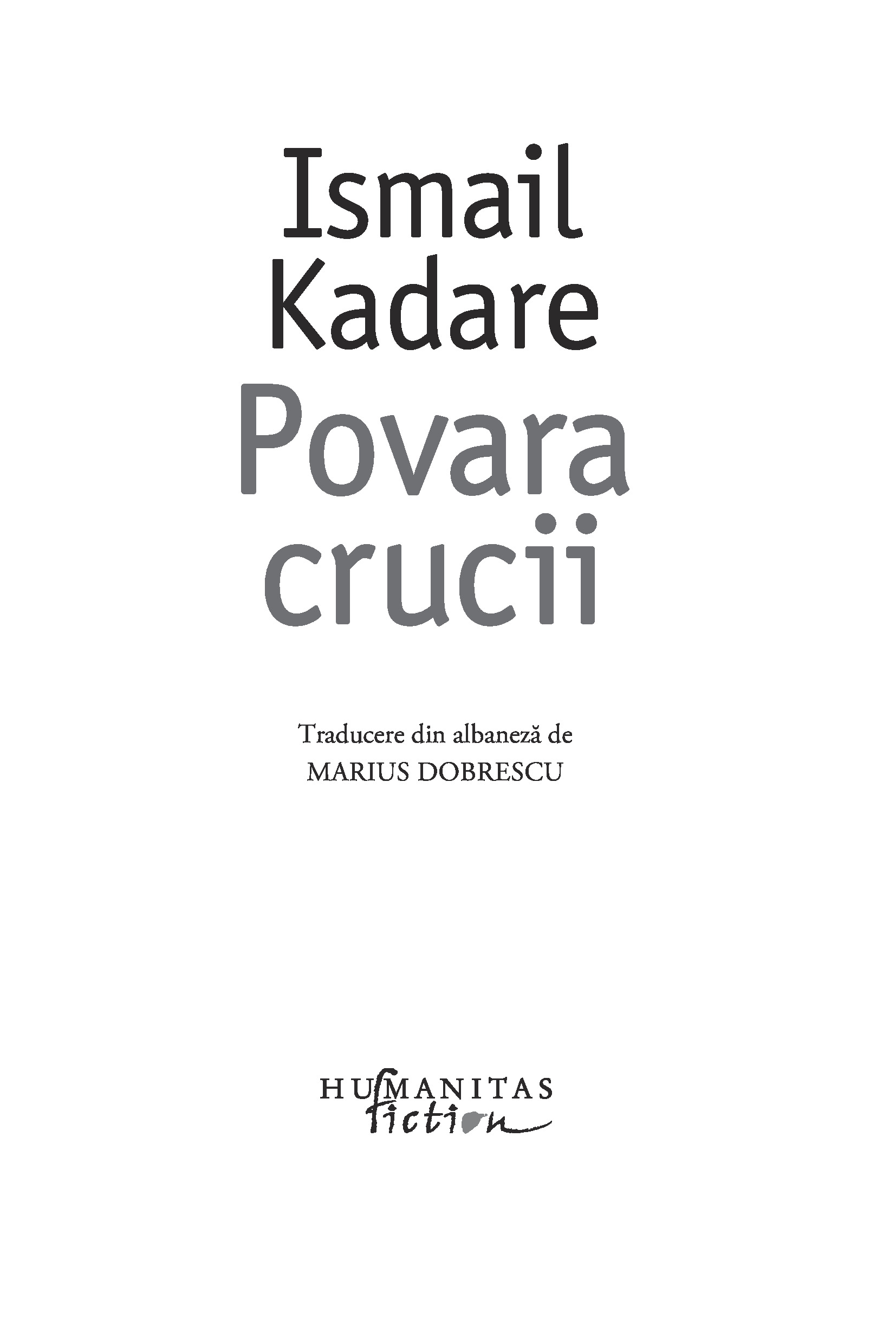 Scriitorul albanez ISMAIL KADARE (1936–2024) a absolvit filologia la Tirana și și-a continuat studiile la Institutul de Literatură Maxim Gorki din Moscova. A debutat la 18 ani cu un volum de poezie, Inspirații juvenile, căruia îi urmează în 1957 un al doilea, Visări. Trecerea la proză o face în 1963 cu romanul Generalul armatei moarte (Humanitas Fiction, 2020), care-i aduce notorietatea internațională. În anii următori publică romane și numeroase volume de povestiri, dobândind o reputație greu de egalat în lumea literară: Cetatea (1970), Mesagerii ploii (1970; Humanitas Fiction, 2010), Cronică în piatră. Vremea nebuniei (1971, 2005; Humanitas Fiction, 2012, 2022), O capitală în noiembrie (1974), Amurgul zeilor stepei (1976; Humanitas Fiction, 2009), Iarna marii însingurări (1977), Aprilie spulberat (1978), Podul cu trei arce (1978; Humanitas Fiction, 2015), Firida Rușinii (1978; Humanitas Fiction, 2016), Palatul Viselor (1981; Humanitas Fiction, 2007), roman interzis de regimul lui Enver Hodja, Concert la sfârșit de iarnă (1988; Humanitas Fiction, 2024). În 1990 Kadare primește azil politic în Franța și până în 2001 locuiește la Paris, perioadă în care îi apar romanele: Piramida (1991), Umbra (1994; Humanitas Fiction, 2008, 2015), Spiritus (1996; Humanitas Fiction, 2012), Florile înghețate din martie (2000). În 2001 Kadare se întoarce în Albania. Continuă să scrie romane care se bucură de succes: Fiica lui Agamemnon (2003), Succesorul (2003), Accidentul (2008; Humanitas Fiction, 2011), Cina blestemată (2009; Humanitas Fiction, 2013), Păpușa (2015; Humanitas Fiction, 2018). Firmanul orb (Humanitas Fiction, 2017) conține cinci dintre nuvelele sale istorice, iar Călărețul cu șoim (Humanitas Fiction, 2020) – patru nuvele investigând absurdul totalitar. Kadare este și autorul unor eseuri și scrieri memorialistice, cum ar fi Povara crucii (1991; Humanitas Fiction, 2025), Dimineți la Café Rostand (2014; Humanitas Fiction, 2021) și Înfruntare la nivel înalt: Misterul convorbirii telefonice Stalin–Pasternak (2018; Humanitas Fiction, 2022). A fost recompensat cu numeroase premii și distincții literare, printre care primul Man Booker International Prize (2005) și Jerusalem Prize (2015). În 2016, statul francez i-a conferit Legiunea de Onoare, în grad de Comandor. Opera sa, nominalizată frecvent la Premiul Nobel, este tradusă în aproape 50 de țări.Scriitorul albanez ISMAIL KADARE (1936–2024) a absolvit filologia la Tirana și și-a continuat studiile la Institutul de Literatură Maxim Gorki din Moscova. A debutat la 18 ani cu un volum de poezie, Inspirații juvenile, căruia îi urmează în 1957 un al doilea, Visări. Trecerea la proză o face în 1963 cu romanul Generalul armatei moarte (Humanitas Fiction, 2020), care-i aduce notorietatea internațională. În anii următori publică romane și numeroase volume de povestiri, dobândind o reputație greu de egalat în lumea literară: Cetatea (1970), Mesagerii ploii (1970; Humanitas Fiction, 2010), Cronică în piatră. Vremea nebuniei (1971, 2005; Humanitas Fiction, 2012, 2022), O capitală în noiembrie (1974), Amurgul zeilor stepei (1976; Humanitas Fiction, 2009), Iarna marii însingurări (1977), Aprilie spulberat (1978), Podul cu trei arce (1978; Humanitas Fiction, 2015), Firida Rușinii (1978; Humanitas Fiction, 2016), Palatul Viselor (1981; Humanitas Fiction, 2007), roman interzis de regimul lui Enver Hodja, Concert la sfârșit de iarnă (1988; Humanitas Fiction, 2024). În 1990 Kadare primește azil politic în Franța și până în 2001 locuiește la Paris, perioadă în care îi apar romanele: Piramida (1991), Umbra (1994; Humanitas Fiction, 2008, 2015), Spiritus (1996; Humanitas Fiction, 2012), Florile înghețate din martie (2000). În 2001 Kadare se întoarce în Albania. Continuă să scrie romane care se bucură de succes: Fiica lui Agamemnon (2003), Succesorul (2003), Accidentul (2008; Humanitas Fiction, 2011), Cina blestemată (2009; Humanitas Fiction, 2013), Păpușa (2015; Humanitas Fiction, 2018). Firmanul orb (Humanitas Fiction, 2017) conține cinci dintre nuvelele sale istorice, iar Călărețul cu șoim (Humanitas Fiction, 2020) – patru nuvele investigând absurdul totalitar. Kadare este și autorul unor eseuri și scrieri memorialistice, cum ar fi Povara crucii (1991; Humanitas Fiction, 2025), Dimineți la Café Rostand (2014; Humanitas Fiction, 2021) și Înfruntare la nivel înalt: Misterul convorbirii telefonice Stalin–Pasternak (2018; Humanitas Fiction, 2022). A fost recompensat cu numeroase premii și distincții literare, printre care primul Man Booker International Prize (2005) și Jerusalem Prize (2015). În 2016, statul francez i-a conferit Legiunea de Onoare, în grad de Comandor. Opera sa, nominalizată frecvent la Premiul Nobel, este tradusă în aproape 50 de țări.