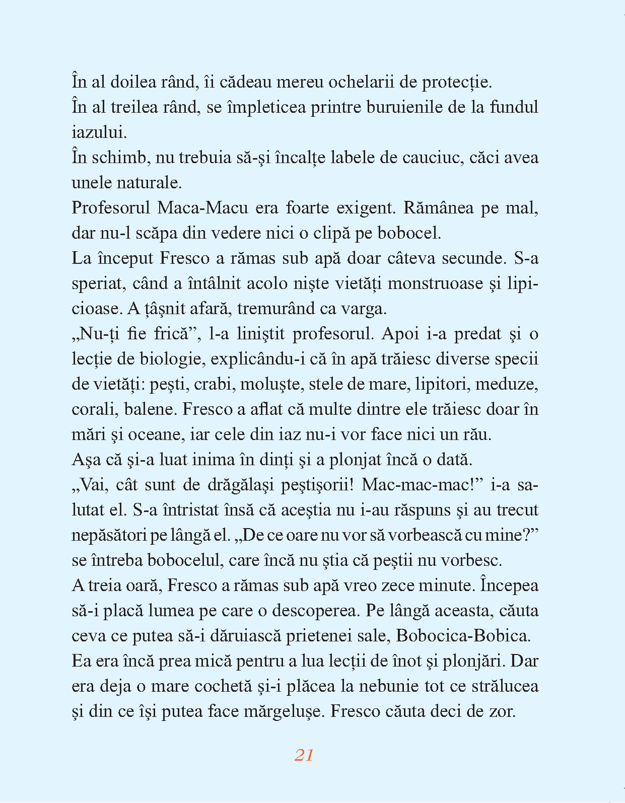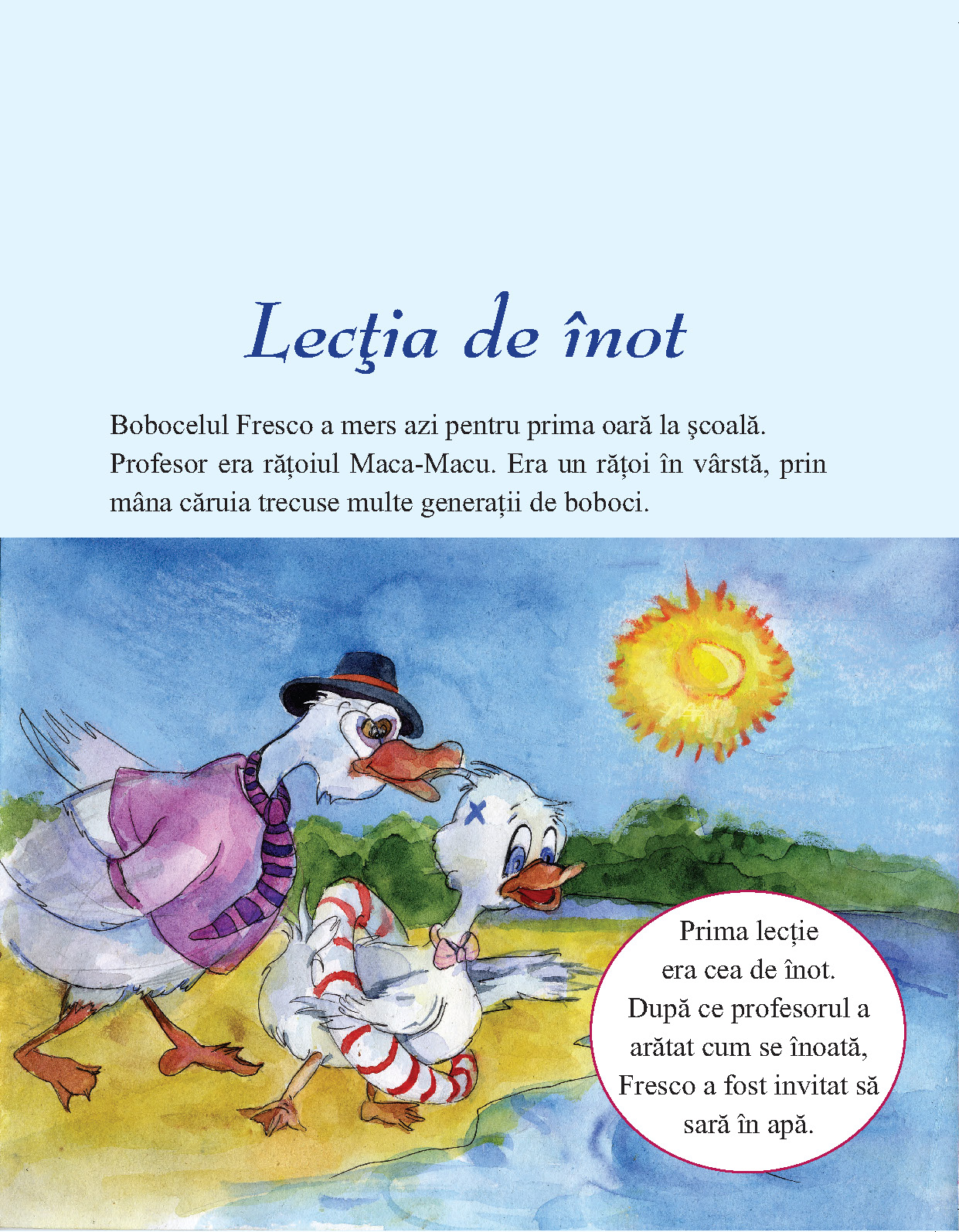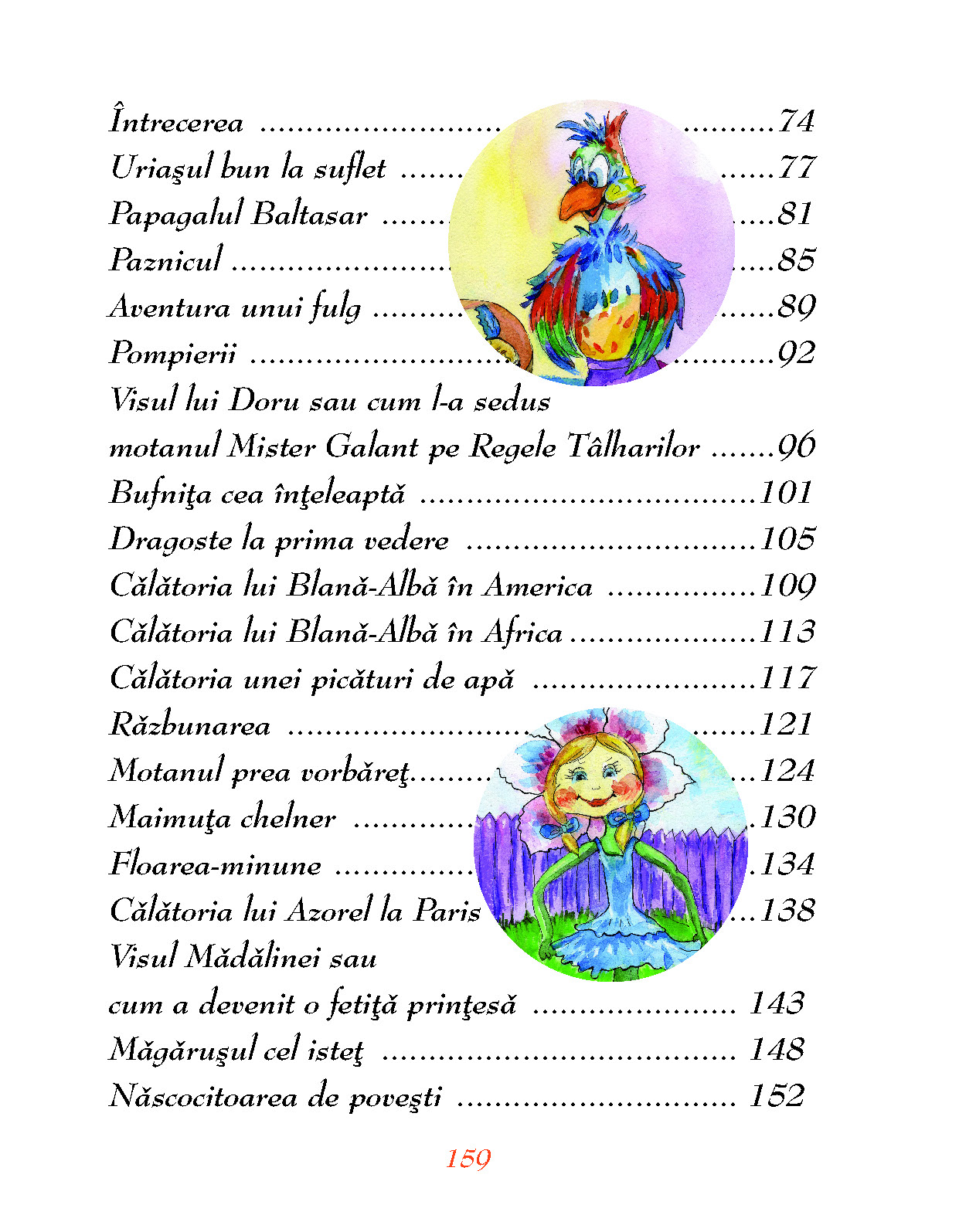 Aceste 40 de istorioare sunt o adaptare a unor povestiri scrise în limba franceză. Ele ne relatează aventurile multor personaje: ale bobocelului Fresco, cocoşului Petroniu, motănaşilor Carol şi Melisa, şoriceilor Tiţ şi Riţ, iepuraşilor Picior-Iute şi Trofăilă, fetiţei care a devenit prinţesă, papagalului Baltasar, ursuleţilor Martinela şi Blană-Albă, peştişorului Einstein, ale unui fulg şi unei picături de apă etc. Cu ajutorul acestor istorioare copiii vor afla cum trebuie să se alimenteze, să-şi îngrijească dantura, să se comporte cu cei din jur, să fie harnici, curajoşi, oneşti şi generoşi.