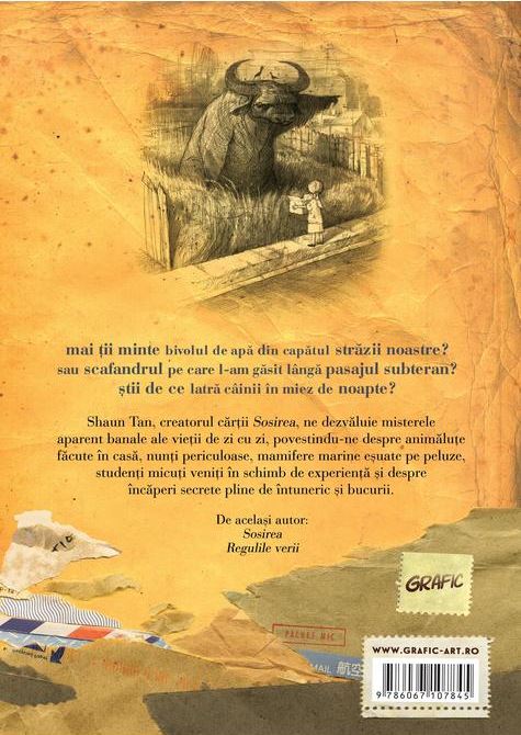 Shaun Tan, creatorul cărții Sosirea, ne dezvăluie misterele aparent banale ale vieții de zi cu zi, povestindu-ne despre animăluțe făcute în casă, nunți periculoase, mamifere marine eșuate pe peluze, studenți micuți veniți în schimb de experiență și despre încăperi secrete pline de întuneric și bucurii.