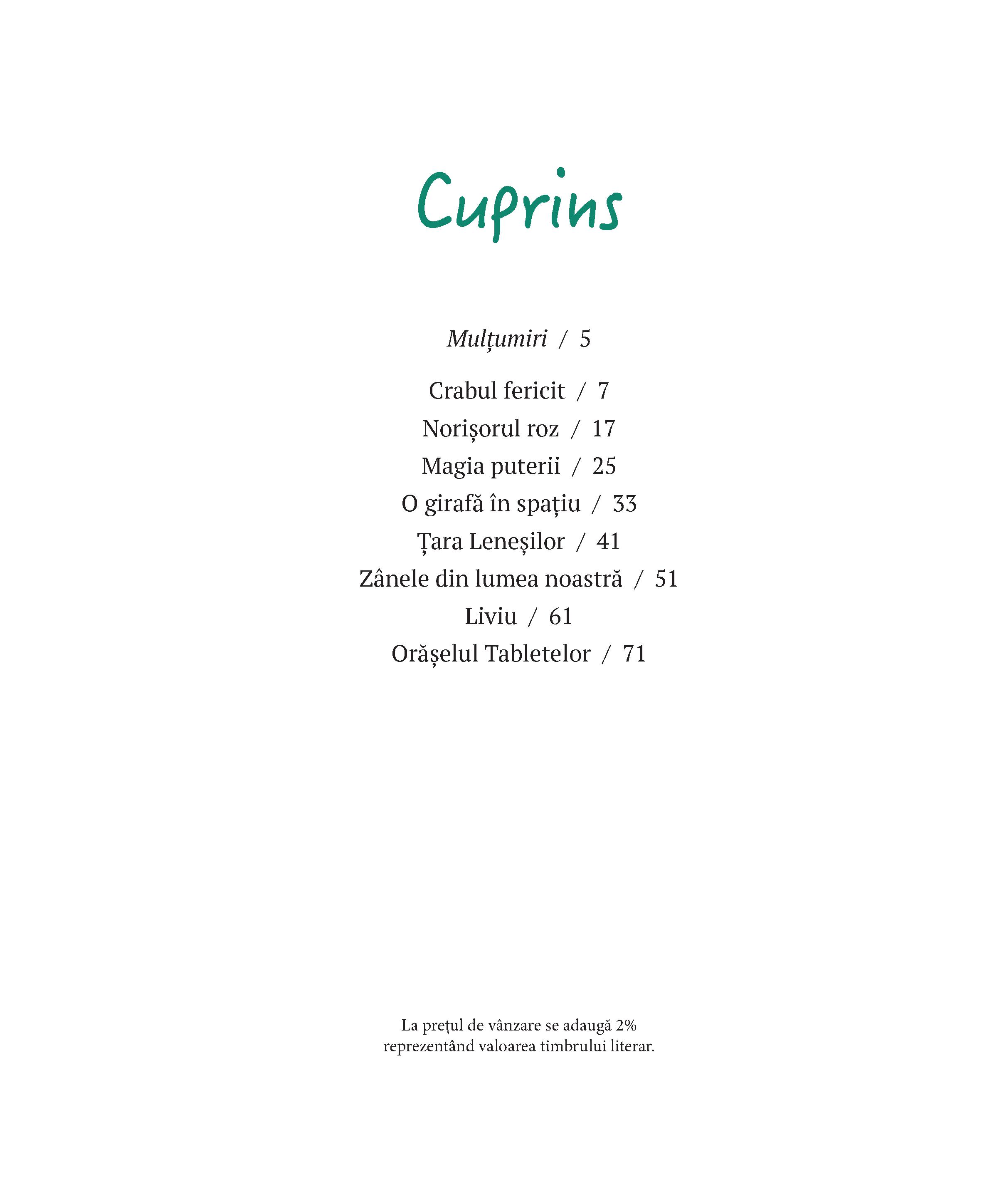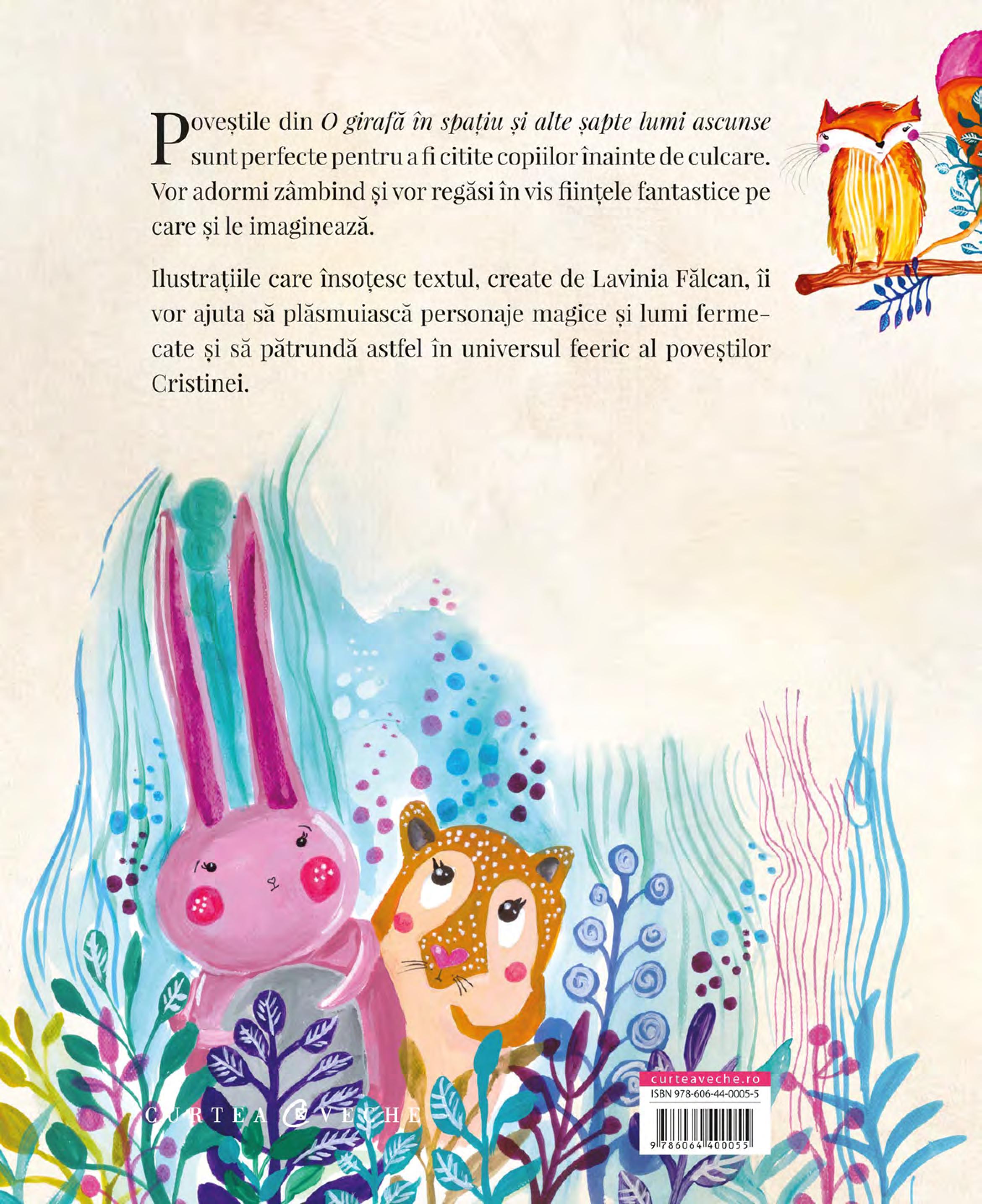 Ilustraţiile care însoţesc textul, create de Lavinia Fălcan, îi vor ajuta să plăsmuiască personaje magice şi universuri fermecate şi să pătrundă astfel în universul feeric al poveştilor Cristinei.