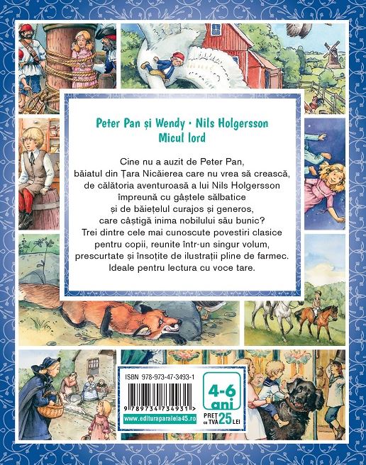 Cine nu a auzit de Peter Pan, băiatul din Țara Nicăierea care nu vrea să crească, de călătoria aventuroasă a lui Nils Holgersson împreună cu gâștele sălbatice și de băiețelul curajos și generos, care câștigă inima nobilului său bunic? Trei dintre cele mai cunoscute povestiri clasice pentru copii, reunite într-un singur volum, prescurtate și însoțite de ilustrații pline de farmec. Ideale pentru lectura cu voce tare.
