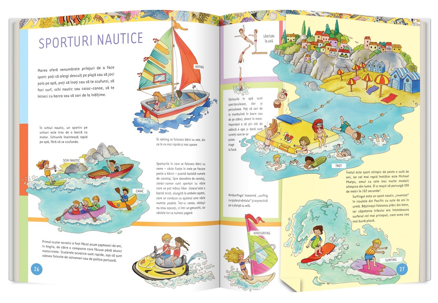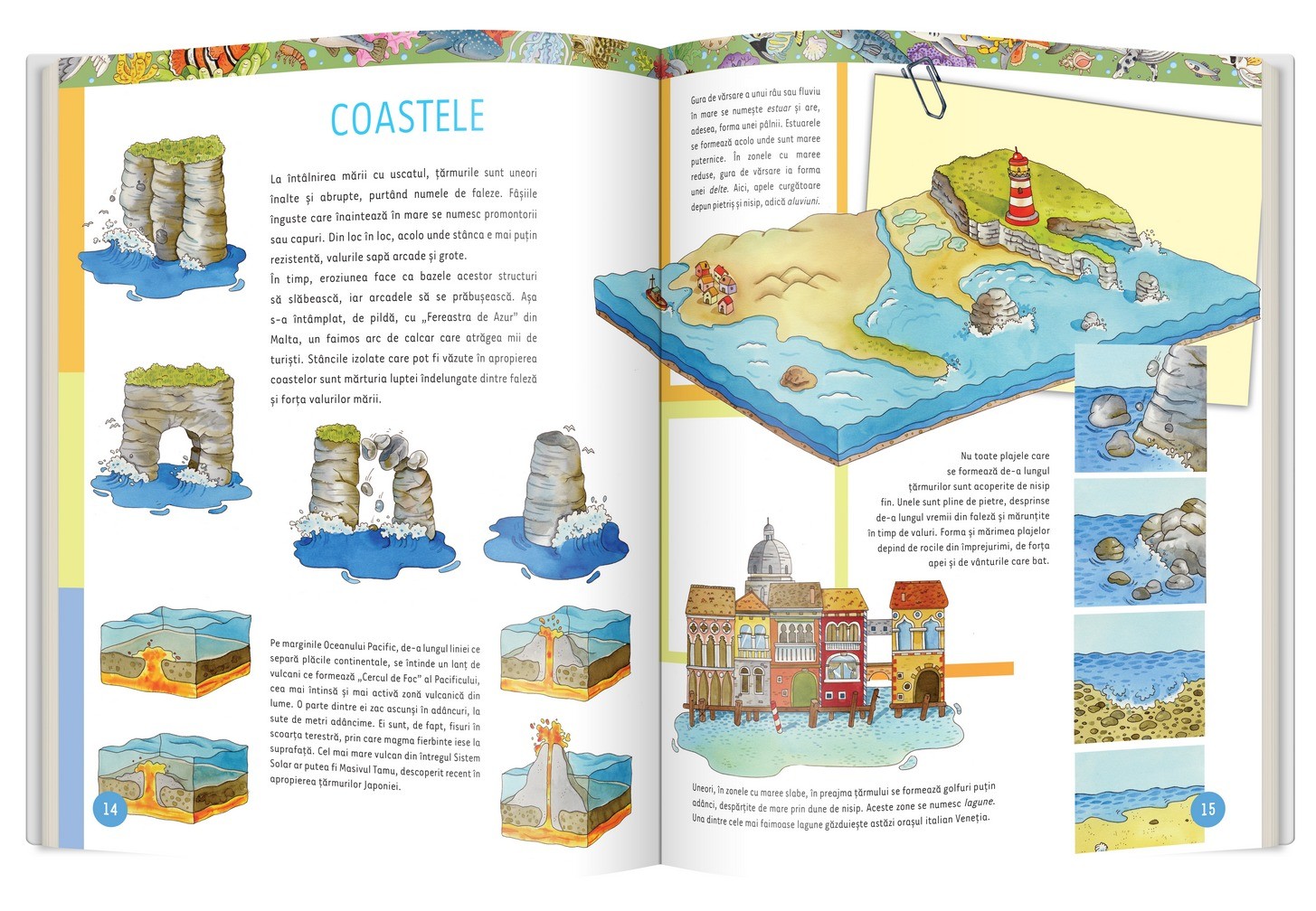 Marea primordială • Abisul • Zona litorală • Coralii • Mări înghețate • Valuri și maree • Coastele • Explorarea adâncurilor • Resursele naturale • Pescuitul • Meserii• Transportul pe apă • Sporturi nautice • Animale interesante • Circuitul apei • Pericolele mării • Legende ale mării • Comori și pirați • Exploratorii