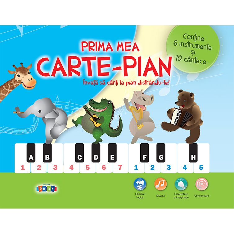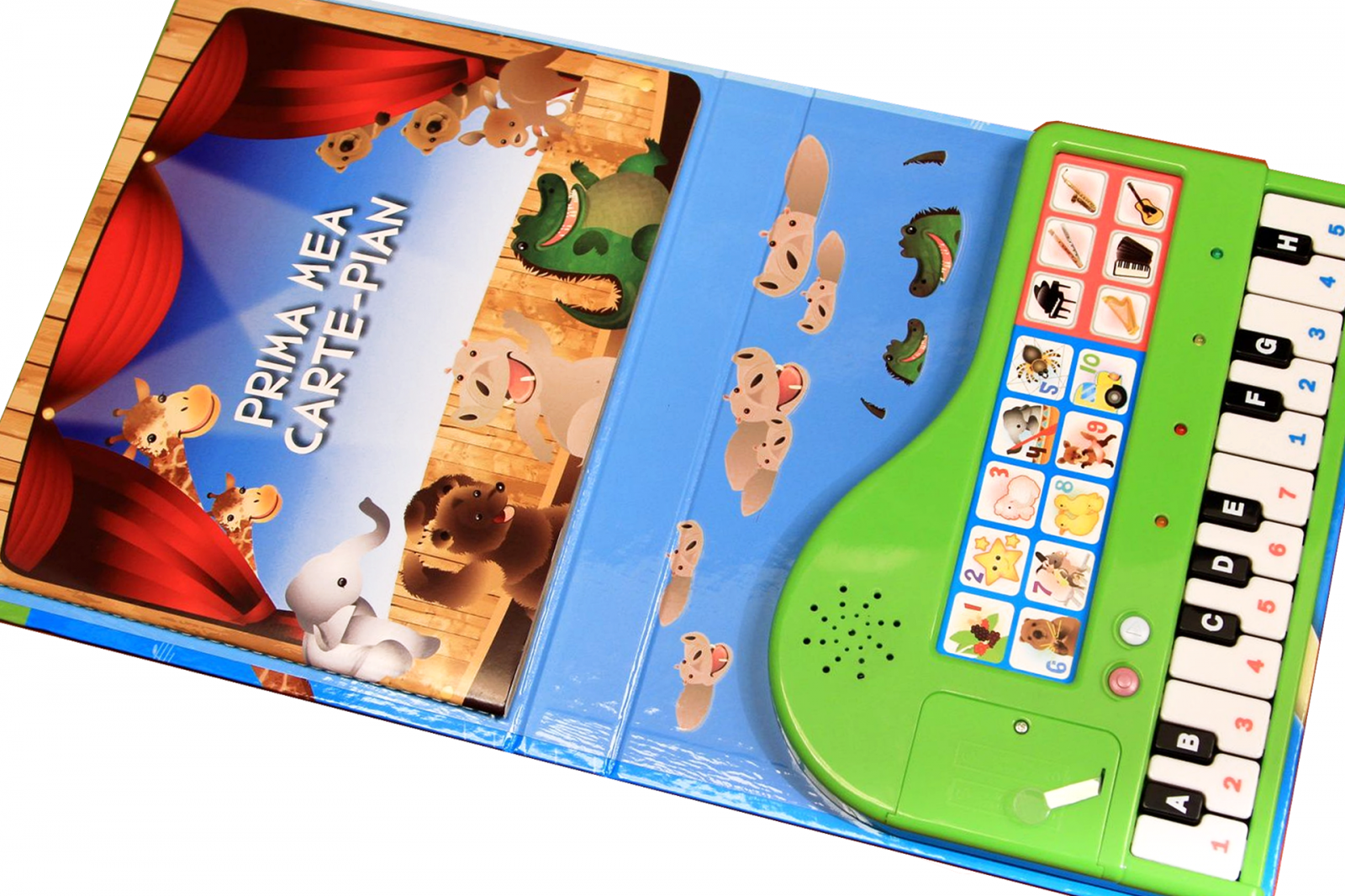 Această carte minunată îl va învață pe cel mic să cânte la pian distrându-se! Copilul poate să cânte cu vocea şi la pian urmărind notele muzicale sau cifrele de sub portativ și găsind aceleaşi semne grafice pe claviatura pianului. Cartea conţine 10 cântece cunoscute pentru copii şi un instrument-jucărie electronic. Modulul electronic include butoane cu 10 melodii preînregistrate și 6 instrumente muzicale clasice, pe care copilul le poate asculta alternativ în timp ce cântă o melodie. Cel mic poate cânta o melodie din carte sau poate crea propria melodie, pe care o poate înregistra sau reda cu ajutorul unor butoane speciale. În timp ce copilul apasă pe clape, 4 leduri colorate luminează intermitent odată cu melodia. Cartea dezvoltă dexteritatea și capacitatea de concentrare, gândirea logică, creativitatea şi imaginaţia copilului.