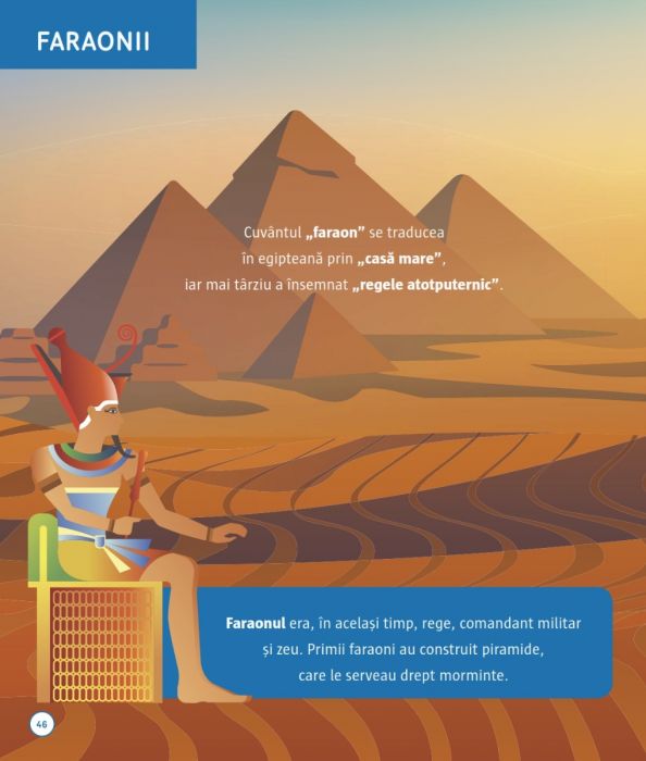 Această enciclopedie bogat ilustrată se adresează copiilor începând cu vârsta de 6 ani. Fiecare perioadă istorică este introdusă printr-o secvență de descoperire, iar apoi aceasta este detaliată în paginile duble organizate tematic: de exemplu, vânătoarea și pescuitul la oamenii preistorici sau puterile faraonului din Egiptul antic.