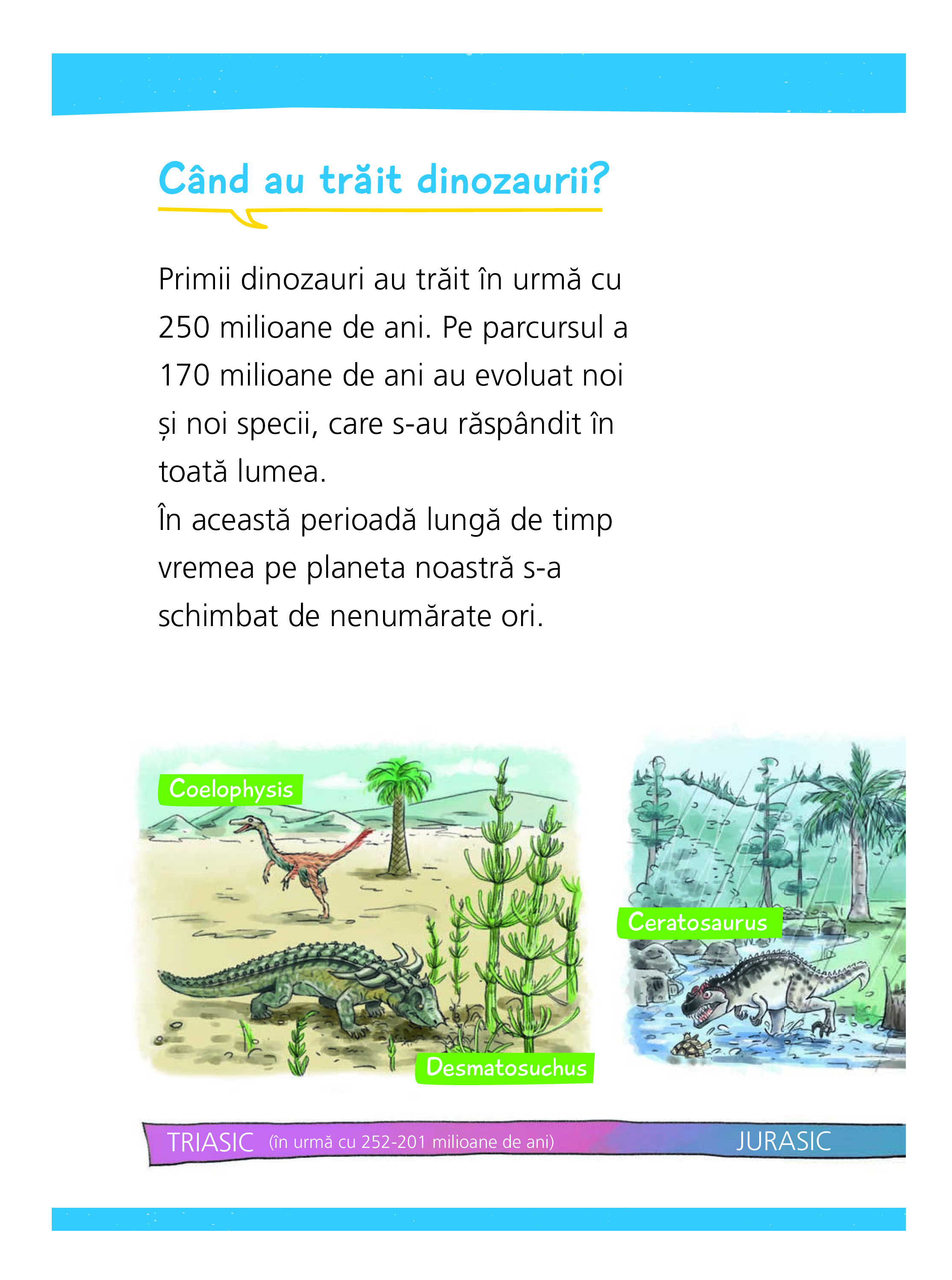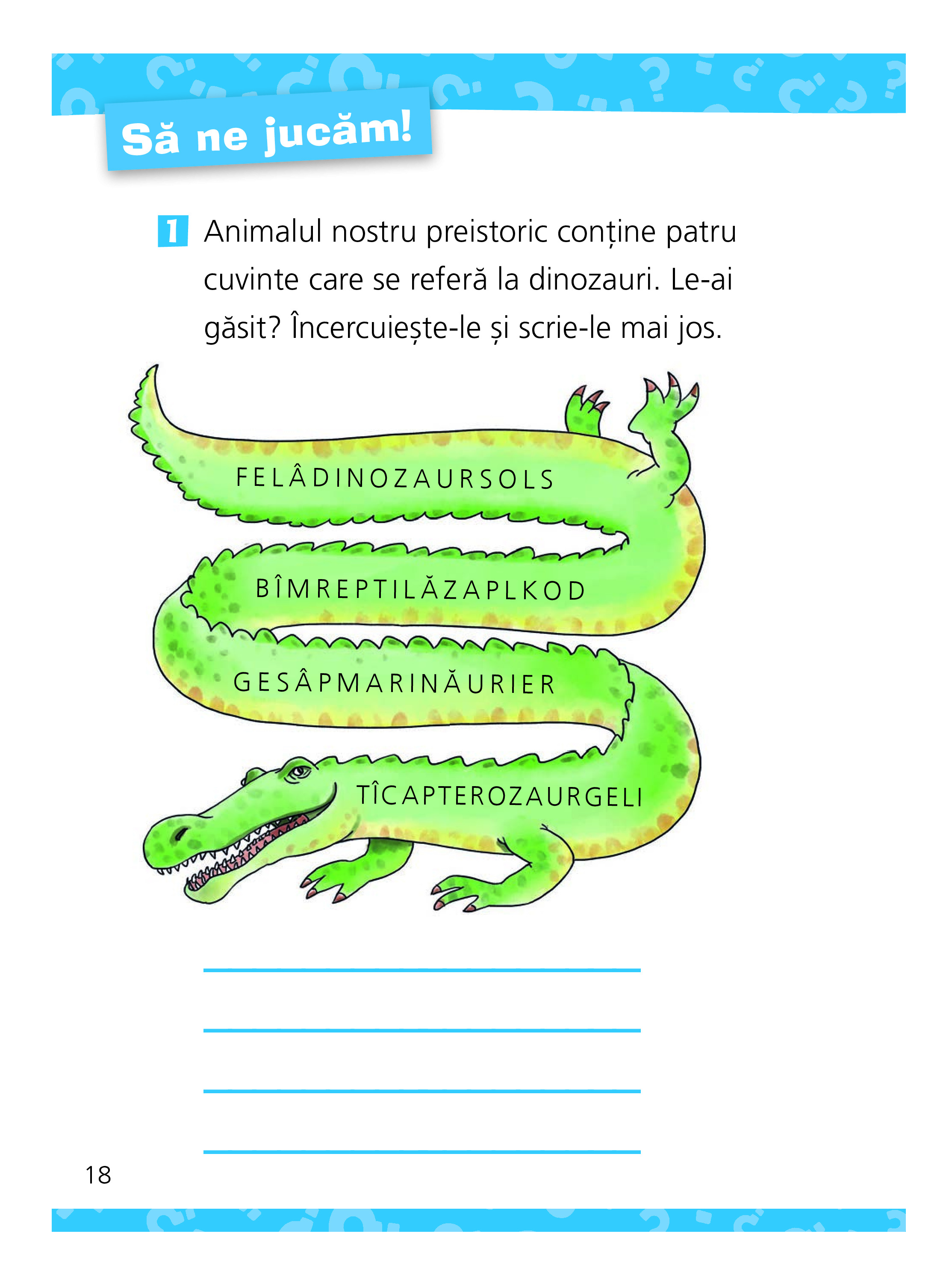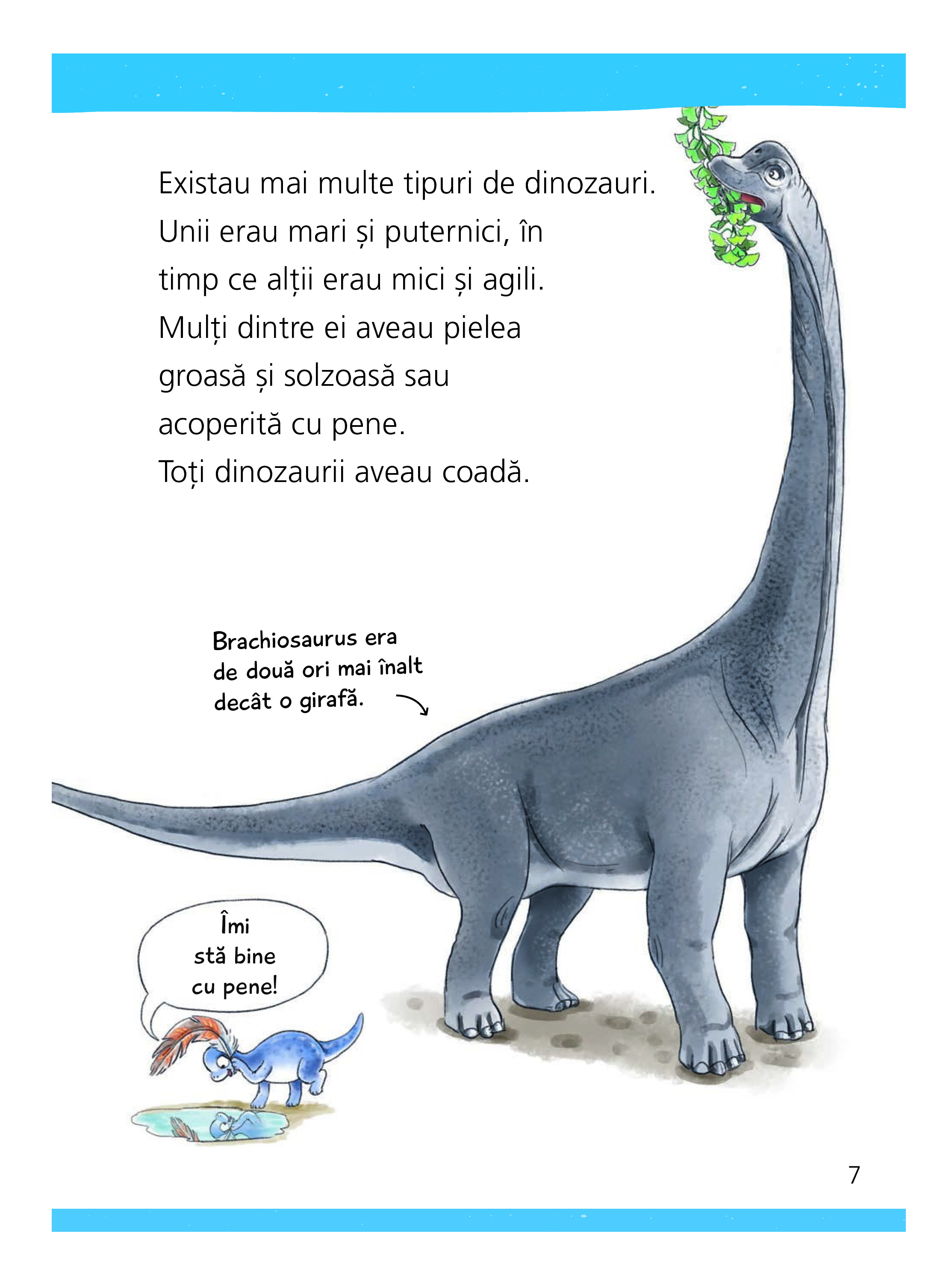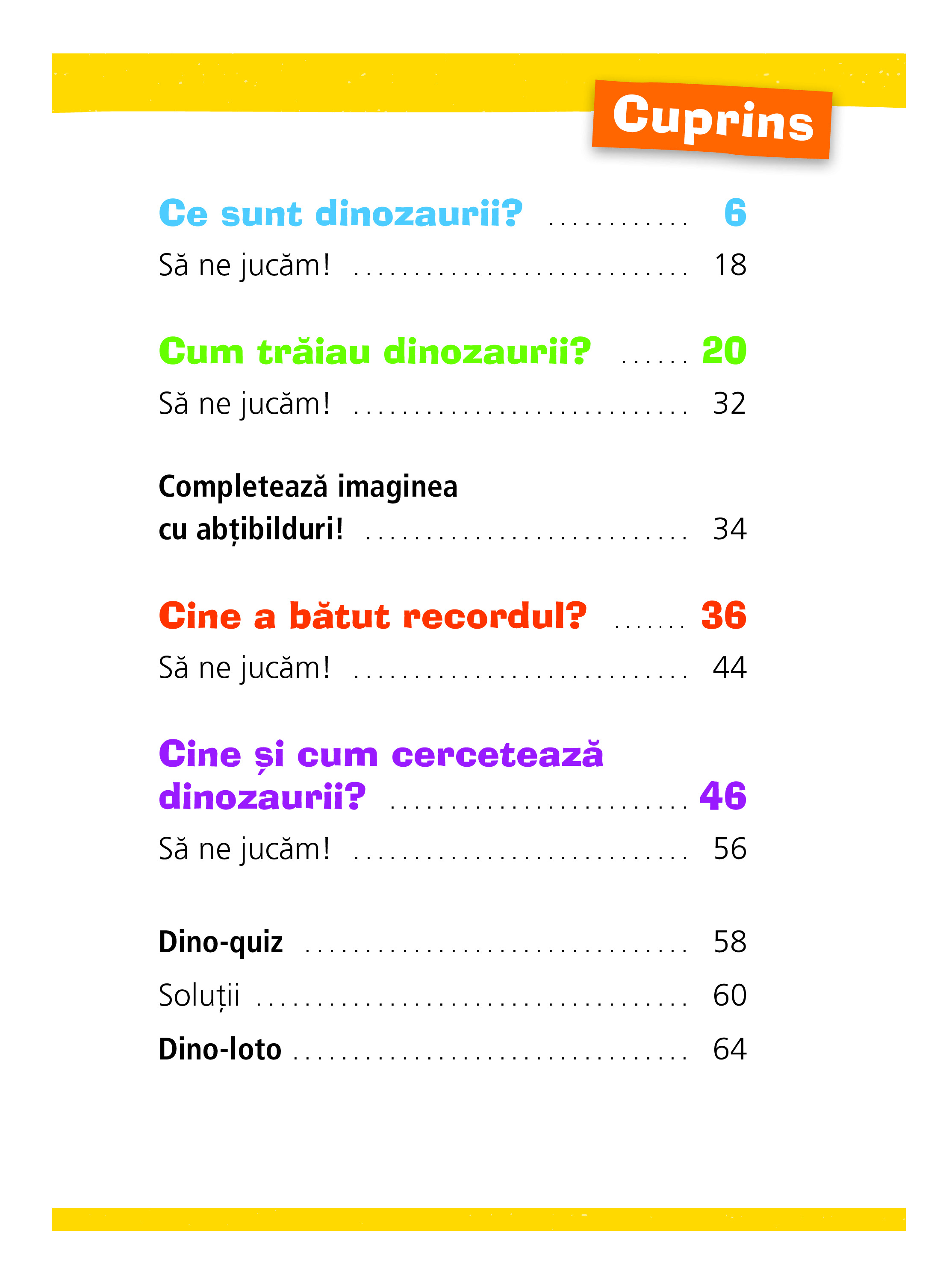 Carte concepută special pentru primele lecturi independente ale unui pasionat de fascinanta lume a dinozaurilor. Pe lângă informații, date și povești despre dinozauri, secțiunile „Să ne jucăm!” de la sfrșitul fiecărui capitol, le propun celor mici joculețe ingenioase, enigme, cuvinte încurcișate și abțibilduri care îi vor ajuta să însușească în mod interactiv informațiile din carte.