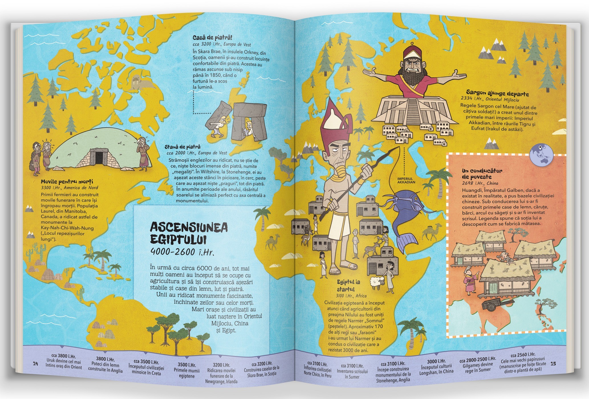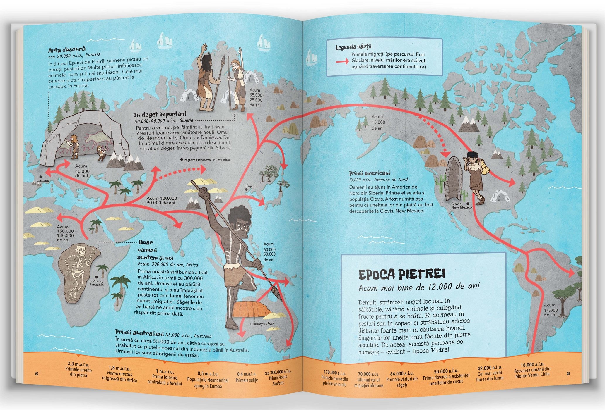 Faptele istorice sunt prezentate cronologic, pe hărți ilustrate, astfel încât copiii să înțeleagă ce se întâmpla în lume în aceeași perioadă de timp.