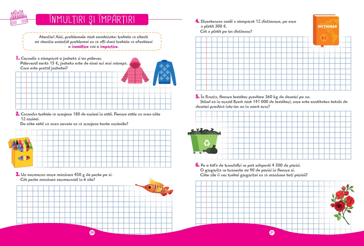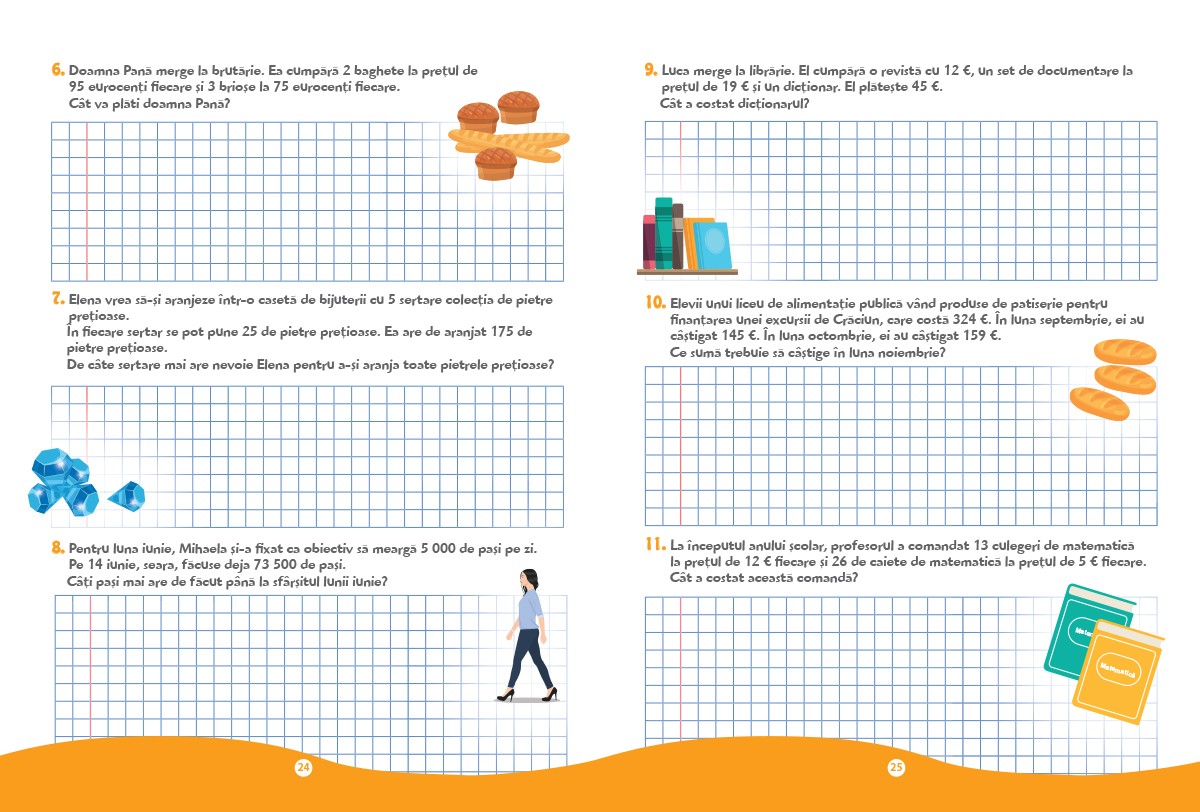 Problemele sunt de dificultate progresivă și te ajută să abordezi corect toate tipurile de probleme cu adunări, scăderi, înmulțiri și împărțiri, precum și unități de măsură.