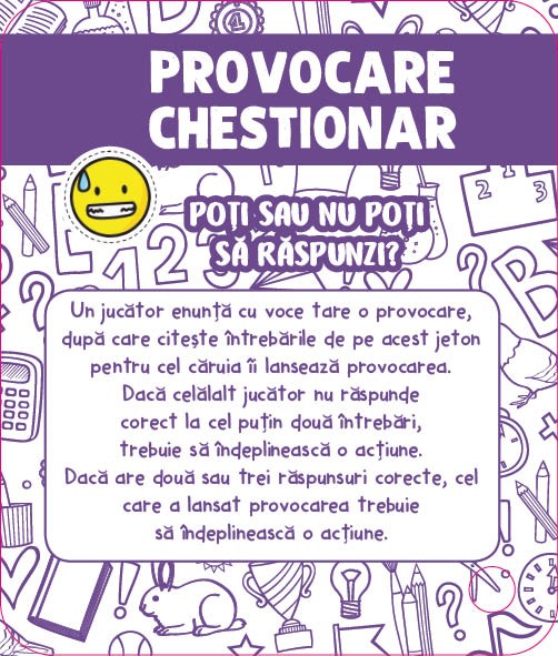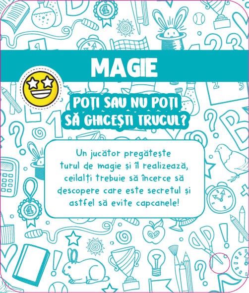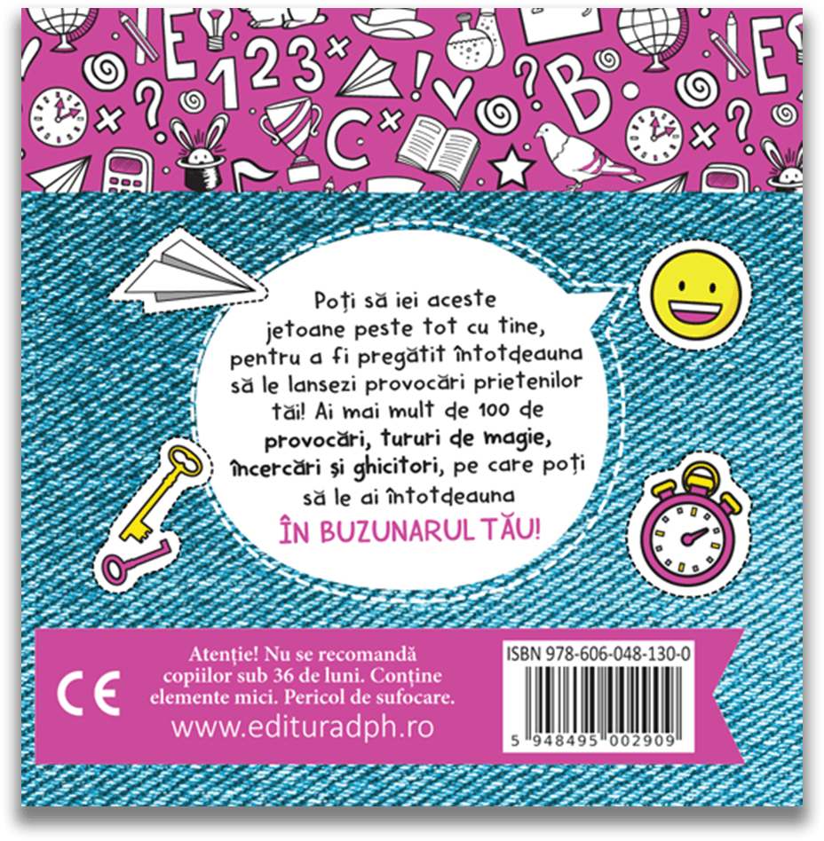 Poți să iei aceste jetoane peste tot cu tine, pentru a fi pregătit întotdeauna să le lansezi provocări prietenilor tăi! Ai mai mult de 100 de provocări, tururi de magie, încercări și ghicitori, pe care poți să le ai întotdeauna în buzunarul tău!