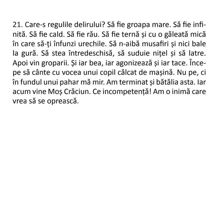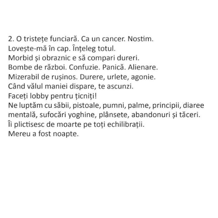 Singurul lucru care răzbate din universul ei închis e câte un strigăt sau, vorba Marianei Marin, câte un scâncet. Îl aude cineva? Poate cititorul la fel de singuratic, la fel de pieziș.