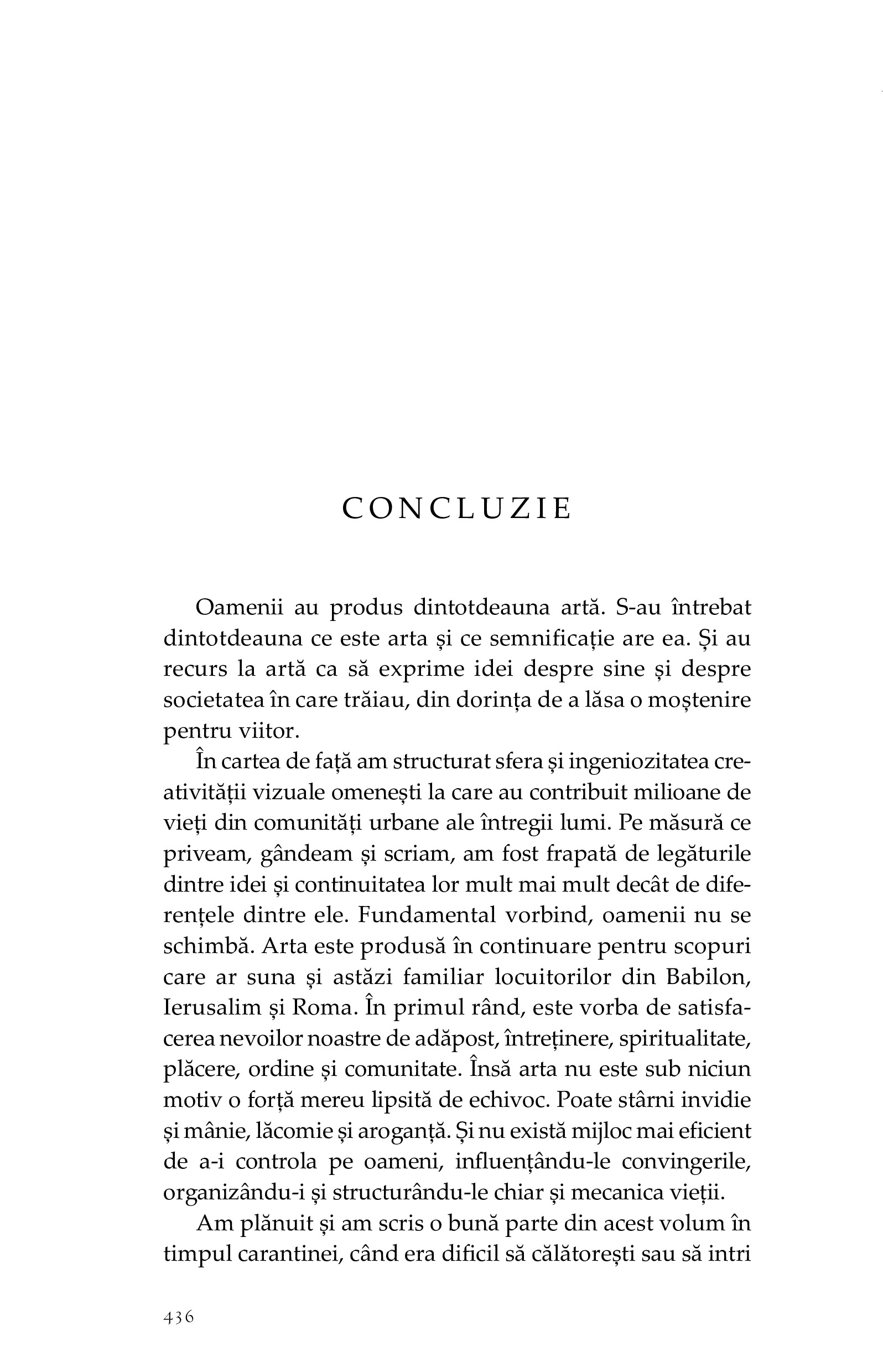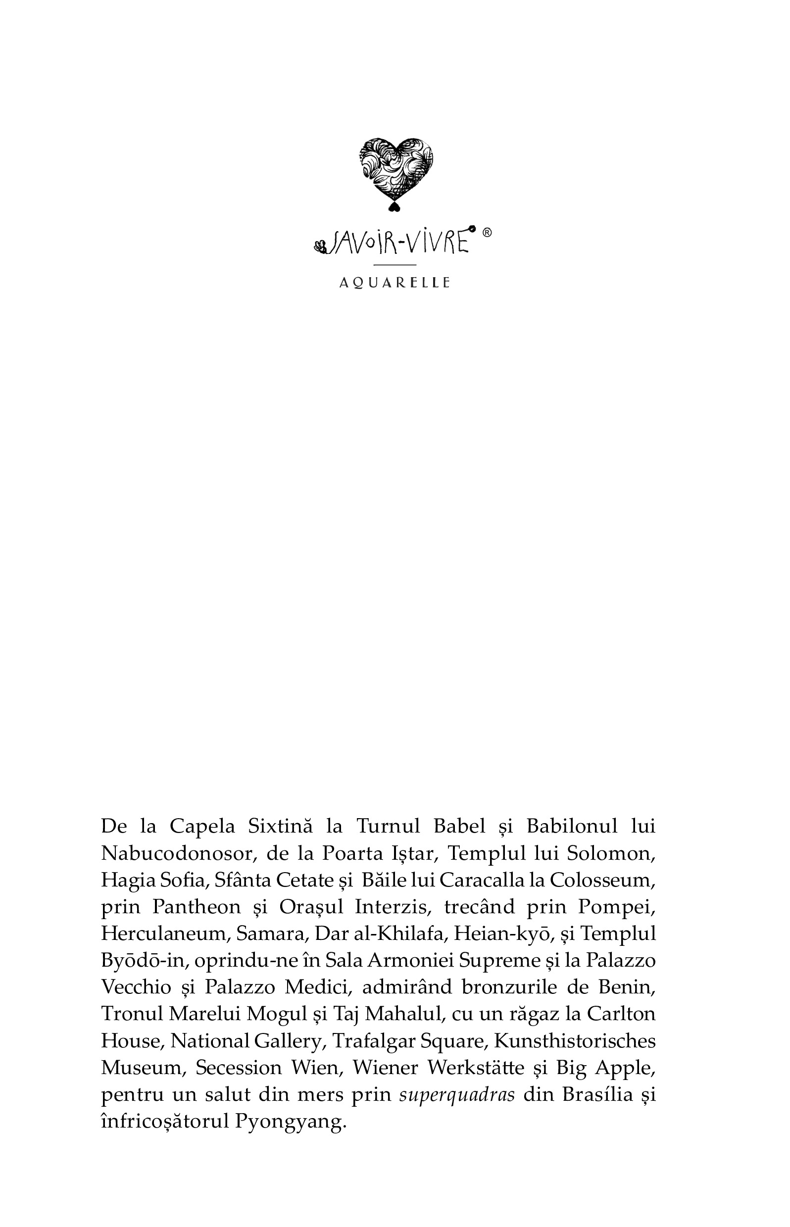 De la Capela Sixtină la Turnul Babel și Babilonul lui Nabucodonosor, de la Poarta Iștar, Templul lui Solomon, Hagia Sofia, Sfânta Cetate și Băile lui Caracalla la Colosseum, prin Pantheon și Orașul Interzis, trecând prin Pompei, Herculaneum, Samara, Dar al-Khilafa, Heian-kyō, și Templul Byōdō-in, oprindu-ne în Sala Armoniei Supreme și la Palazzo Vecchio și Palazzo Medici, admirând bronzurile de Benin, Tronul Marelui Mogul și Taj Mahalul, cu un răgaz la Carlton House, National Gallery, Trafalgar Square, Kunsthistorisches Museum, Secession Wien, Wiener Werkstätte și Big Apple, pentru un salut din mers prin superquadras din Brasília și înfricoșătorul Pyongyang.