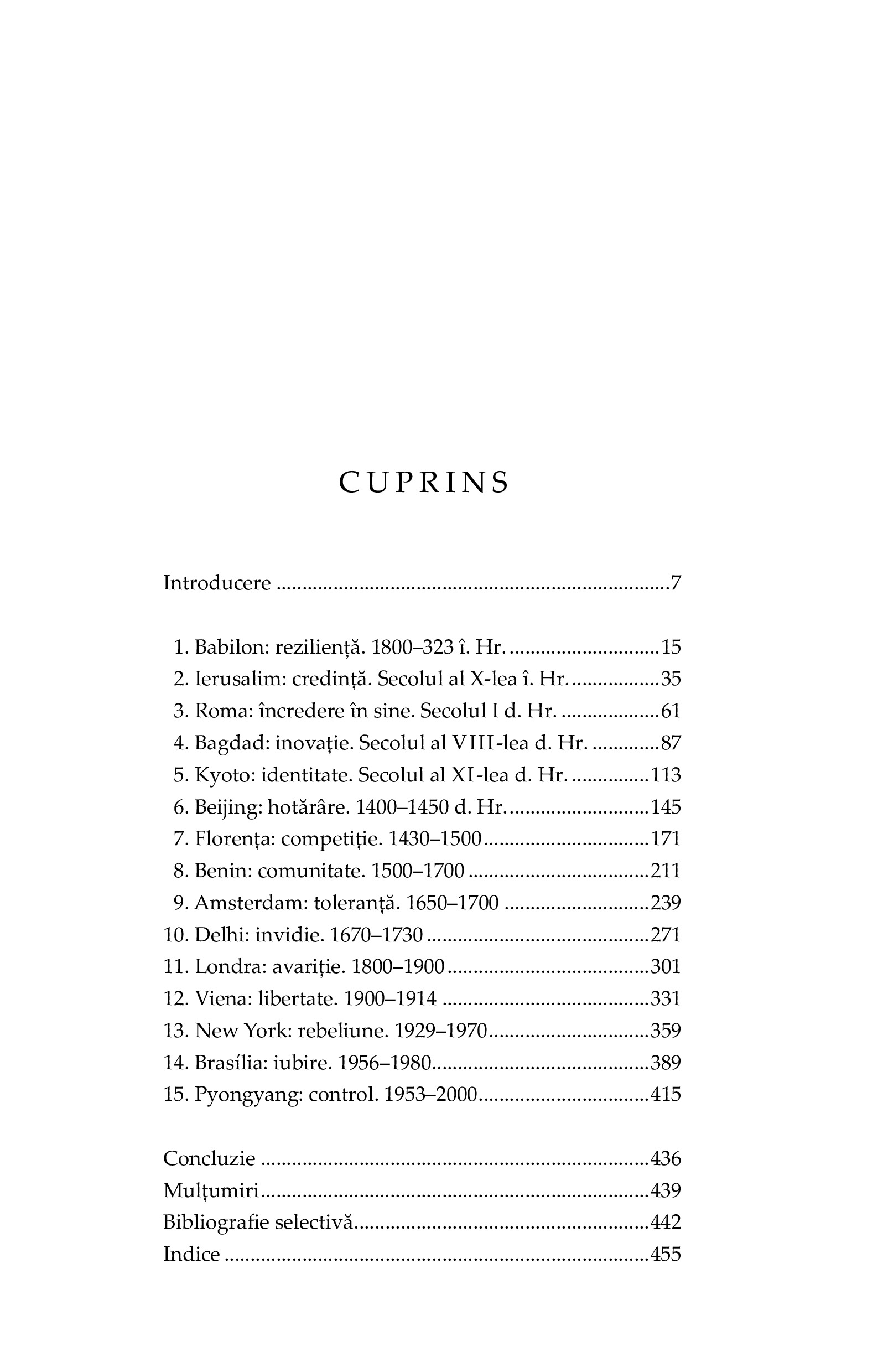 Babilon: reziliență • Ierusalim: credință • Roma: încredere în sine • Bagdad: inovație • Kyoto: identitate • Beijing: hotărâre • Florența: concurență • Benin: comunitate • Amsterdam: toleranță • Delhi: invidie • Londra: avariție • Viena: libertate • New York: rebeliune • Brasília: iubire • Pyongyang: control