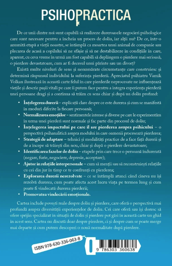 Exista multe niveluri de sens si nenumarate circumstante care construiesc si determina raspunsul individului la suferinta pierderii. Apreciatul psihiatru Vamik Volkan ilustreaza in aceasta carte felul in care pierderile neprocesate ne influenteaza vietile si descrie pasii vitali pe care ii putem face pentru a integra experienta pierderii unei persoane dragi si a continua sa traim cu sens chiar si dupa un doliu profund: