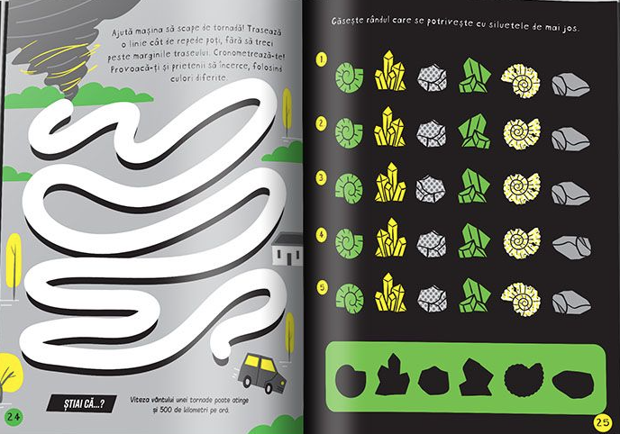Aceste activitati si enigme de rezolvat – pe teme fascinante, precum dinozaurii, Universul, planeta Pamant sau tot felul de masinarii complexe – pun mintea la treaba si dezvolta perspicacitatea si gandirea logica.