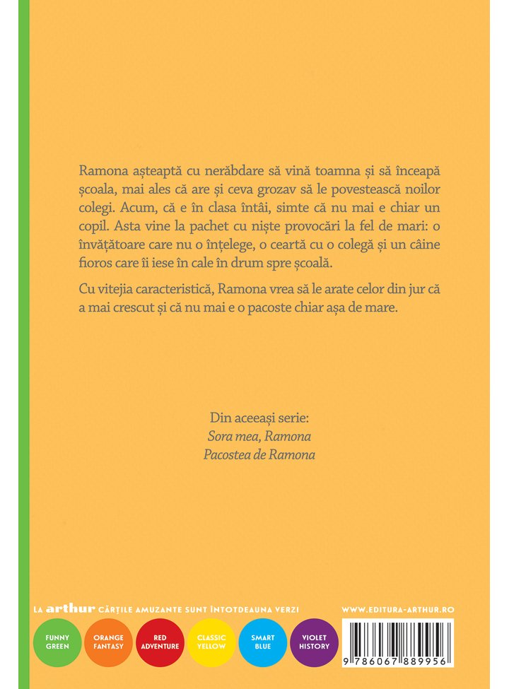 Ramona a așteptat cu nerăbdare să vină toamna și să înceapă școala, mai ales că are și ceva grozav să le povestească noilor colegi. Acum, că e în clasa întâi, simte că nu mai o fetiță,iar asta vine la pachet cuniște provocări la fel de mari: o învățătoare care nu o înțelege, o ceartă cu o colegă și un câine fioros care îi iese în cale în drum spre școală.