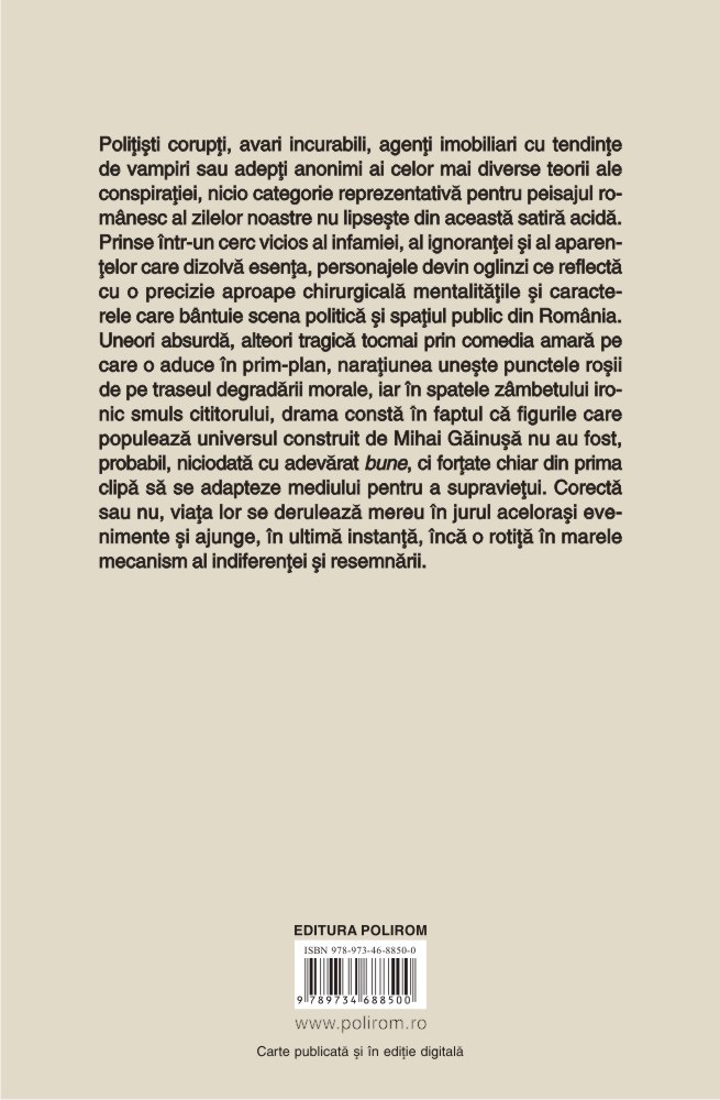Polițiști corupți, avari incurabili, agenți imobiliari cu tendințe de vampiri sau adepți anonimi ai celor mai diverse teorii ale conspirației, nicio categorie reprezentativă pentru peisajul românesc al zilelor noastre nu lipsește din această satiră acidă. Prinse într-un cerc vicios al infamiei, al ignoranței și al aparențelor care dizolvă esența, personajele devin oglinzi ce reflectă cu o precizie aproape chirurgicală mentalitățile și caracterele care bântuie scena politică și spațiul public din România. Uneori absurdă, alteori tragică tocmai prin comedia amară pe care o aduce în prim-plan, narațiunea unește punctele roșii de pe traseul degradării morale, iar în spatele zâmbetului ironic smuls cititorului, drama constă în faptul că figurile care populează universul construit de Mihai Găinușă nu au fost, probabil, niciodată cu adevărat bune, ci forțate chiar din prima clipă să se adapteze mediului pentru a supraviețui. Corectă sau nu, viața lor se derulează mereu în jurul acelorași evenimente și ajunge, în ultimă instanță, încă o rotiță în marele mecanism al indiferenței și resemnării.