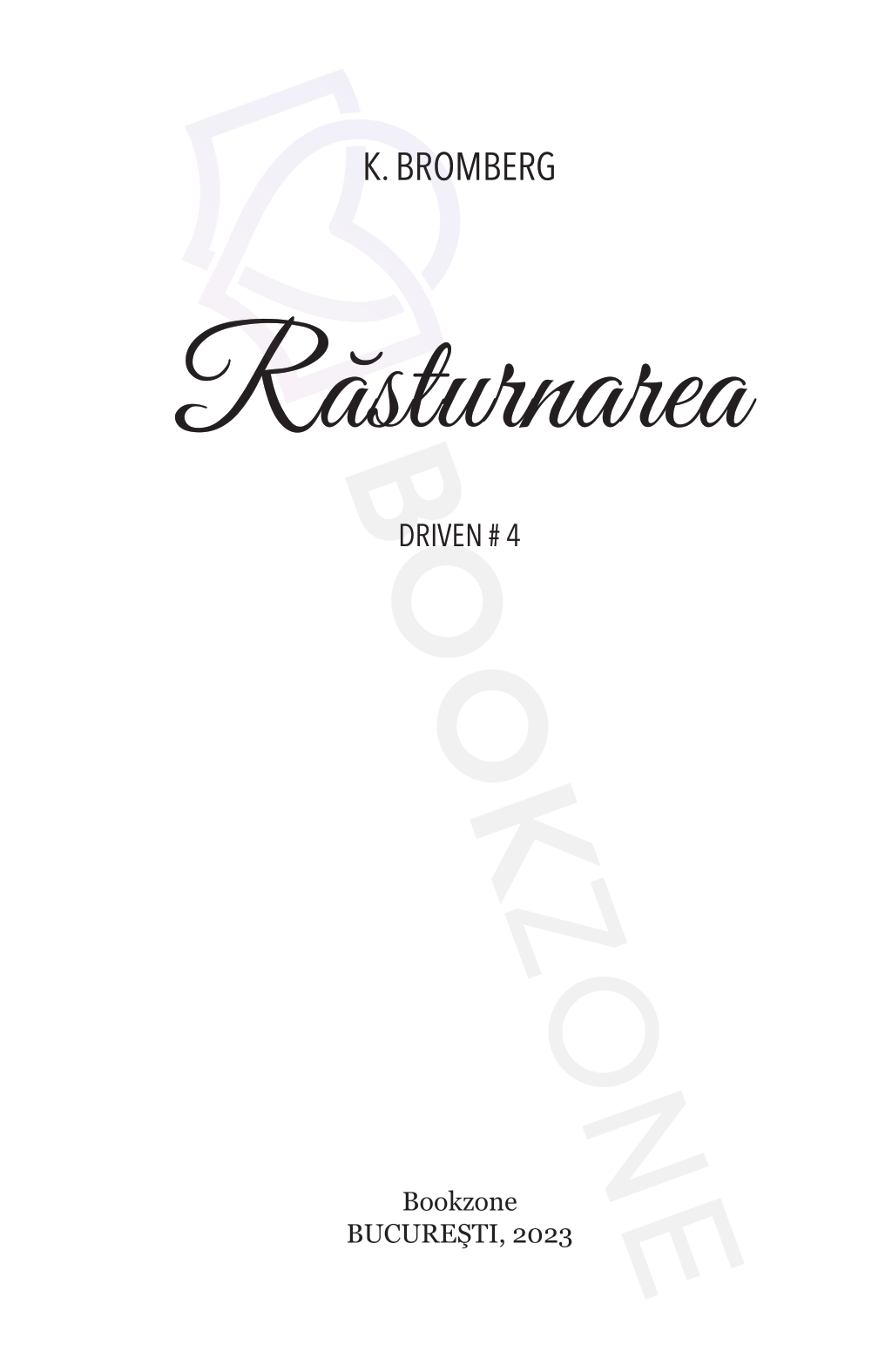 Scrisă la cererea cititorilor, Răsturnarea completează primele trei volume ale seriei #Driven, oferind fanilor șansa de a privi unele dintre momentele-cheie ale relației dintre Colton și Rylee prin ochii lui nespus de verzi. În încercarea de a reda cât mai realist punctul de vedere al eroului, K. Bromberg a inclus în acest volum atât scene regândite și rescrise din volumele anterioare, cât și capitole absolut noi, care dezvăluie fațete neştiute ale personajului.
