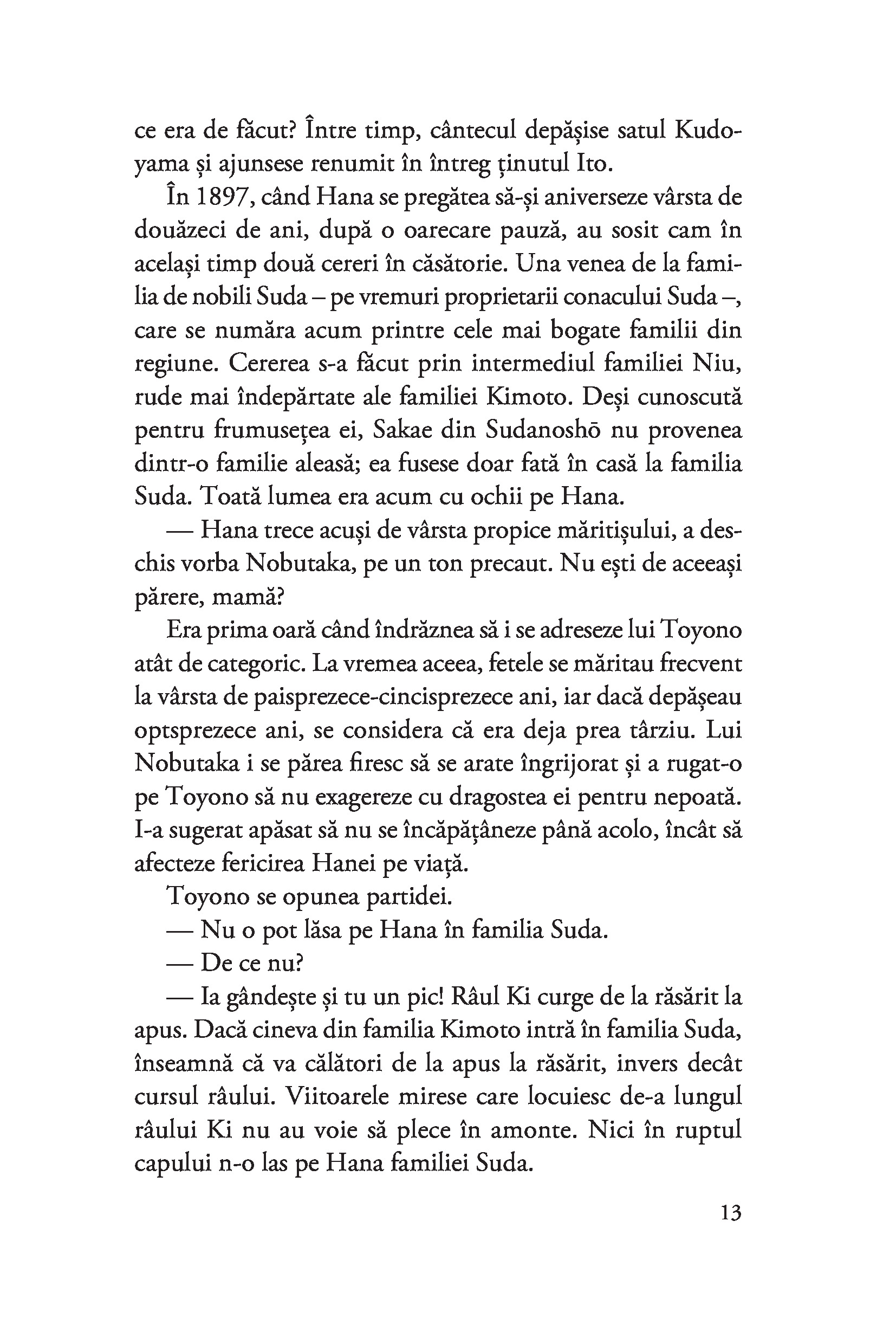 În această saga multigenerațională, femeile din familia Kimoto se dovedesc firi puternice și impunătoare, fie moștenitoare ale tradițiilor și ceremoniilor nipone, fie adepte ale schimbărilor iminente de la început de secol XX. Hana, fiica ei, Fumio, și nepoata Hanako sunt personajele ale căror destine râul Ki le va purta cu sine. De la relațiile complicate din sânul familiei și până la contextul social și politic cu impact direct asupra statutului femeii în societate, romanul lui Sawako Ariyoshi surprinde revirimentul cultural care a marcat sfârșitul orânduirii tradiționale din Japonia.