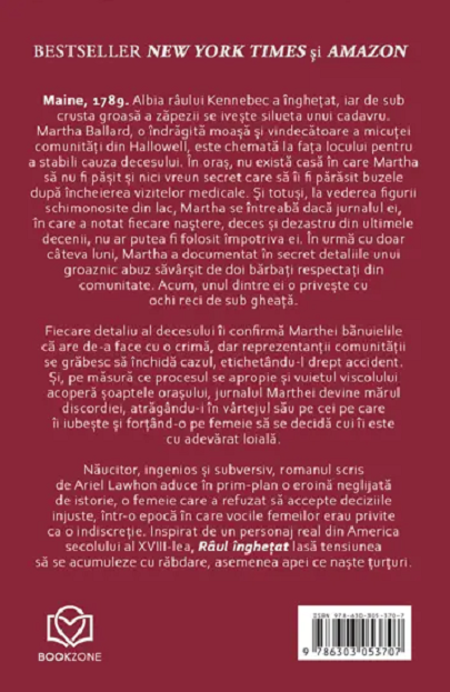 Năucitor, ingenios şi subversiv, romanul scris de Ariel Lawhon aduce în prim-plan o eroină neglijată de istorie, o femeie care a refuzat să accepte deciziile injuste, într-o epocă în care vocile femeilor erau privite ca o indiscreţie. Inspirat de un personaj real din America secolului al XVIII-lea, Râul înghețat lasă tensiunea să se acumuleze cu răbdare, asemenea apei ce naşte țurțuri.