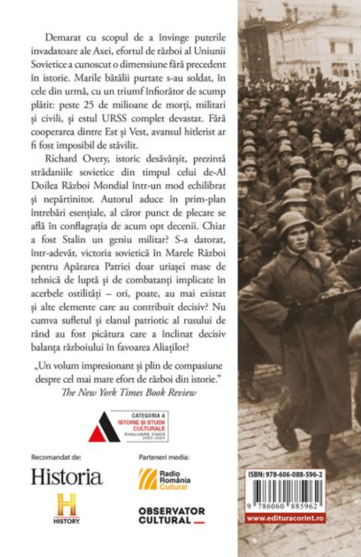 Richard Overy, istoric desăvârșit, prezintă strădaniile sovietice din timpul celui de-Al Doilea Război Mondial într-un mod echilibrat și nepărtinitor. Autorul aduce în prim-plan întrebări esențiale, al căror punct de plecare se află în conflagrația de acum opt decenii. Chiar a fost Stalin un geniu militar? S-a datorat, într-adevăr, victoria sovietică în Marele Război pentru Apărarea Patriei doar uriașei mase de tehnică de luptă și de combatanți implicate în acerbele ostilități – ori, poate, au mai existat și alte elemente care au contribuit decisiv? Nu cumva sufletul și elanul patriotic al rusului de rând au fost picătura care a înclinat decisiv balanța războiului în favoarea Aliaților?