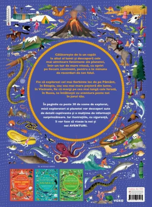 În paginile cu peste 30 de scene de explorat, micii exploratori ai planetei vor descoperi sute de detalii captivante și o mulțime de informații surprinzătoare. Iar ilustrațiile, cu siguranță, îi vor face să viseze la noi și noi AVENTURI.