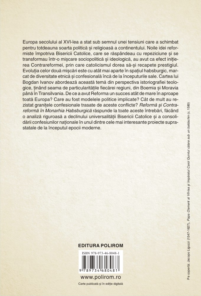 Europa secolului al XVI-lea a stat sub semnul unei tensiuni care a schimbat pentru totdeauna soarta politică și religioasă a continentului. Noile idei reformiste împotriva Bisericii Catolice, care se răspîndeau cu repeziciune și se transformau într-o mișcare sociopolitică și ideologică, au avut ca efect inițierea Contrareformei, prin care catolicismul dorea să-și recapete prestigiul. Evoluția celor două mișcări este cu atît mai aparte în spațiul habsburgic, marcat de diversitate etnică și confesională încă de la începuturile sale. Cartea lui Bogdan Ivanov abordează această temă din perspectiva istoriografiei teologice, ținînd seama de particularitățile fiecărei regiuni, din Boemia și Moravia până în Transilvania. Cititorul va descoperi o analiză riguroasă a declinului universalității Bisericii Catolice și a consolidării confesiunilor naționale în unul dintre cele mai interesante proiecte suprastatale de la începutul epocii moderne.