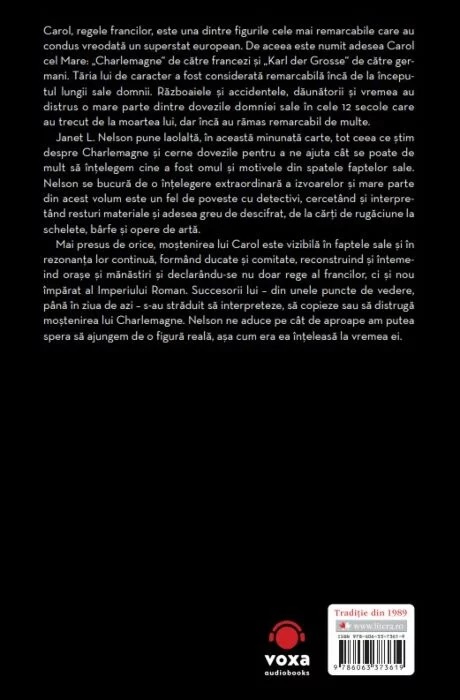 Janet L. Nelson pune laolaltă, în această minunată carte, tot ceea ce știm despre Charlemagne și cerne dovezile pentru a ne ajuta cât se poate de mult să înțelegem cine a fost omul și motivele din spatele faptelor sale. Nelson se bucură de o înțelegere extraordinară a izvoarelor și mare parte din acest volum este un fel de poveste cu detectivi, cercetând și interpretând resturi materiale și adesea greu de descifrat, de la cărți de rugăciune la schelete, bârfe și opere de artă.