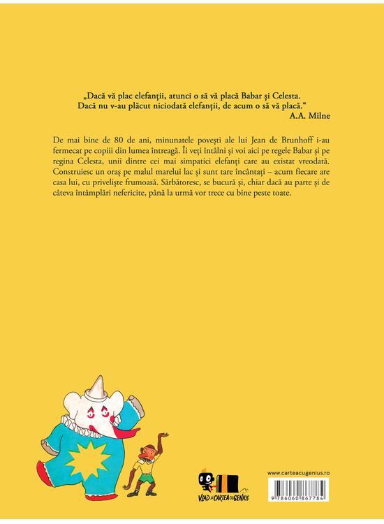 De mai bine de 80 de ani, minunatele povești ale lui Jean de Brunhoff i-au fermecat pe copiii din lumea întreagă. Îi veți întâlni și voi aici pe regele Babar și pe regina Celesta, unii dintre cei mai simpatici elefanți care au existat vreodată. Construiesc un oraș pe malul marelui lac și sunt tare încântați - acum fiecare are casa lui, cu priveliște frumoasă. Sărbătoresc, se bucură și, chiar dacă au parte și de câteva întâmplări nefericite, până la urmă vor trece cu bine peste toate.