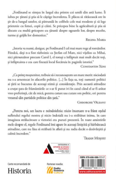 Istoria va numi, desigur, pe Ferdinand I cel mai mare rege al românilor. Fiindcă deși n-a fost războinic ca Ștefan cel Mare, nici vijelios ca Mihai, nici pătrunzător ca un Carol I, el totuși a înfăptuit mai mult decât toți, și înfăptuirea e cea care fixează locul fiecăruia în paginile istoriei. - Constantin Xeni